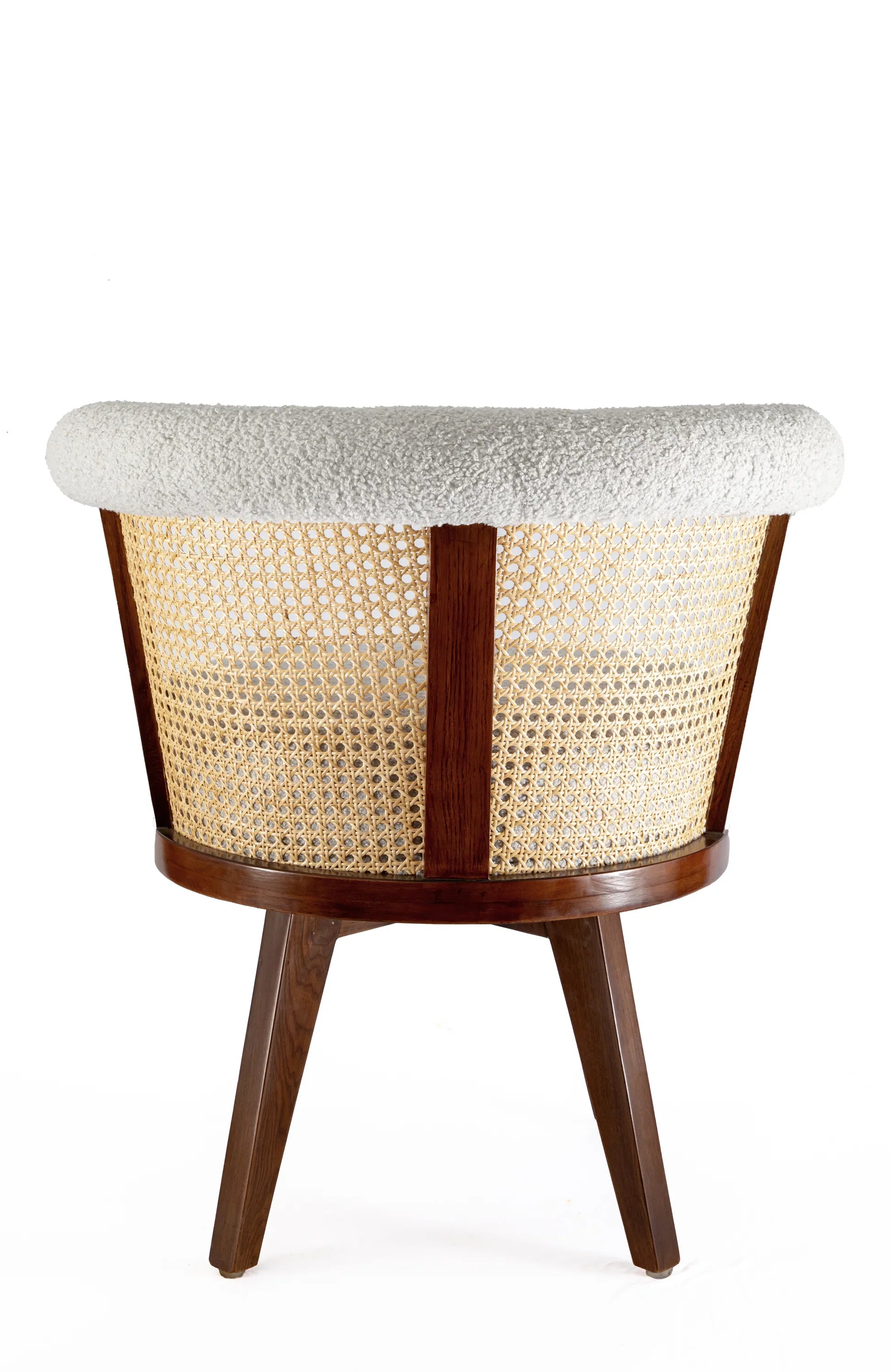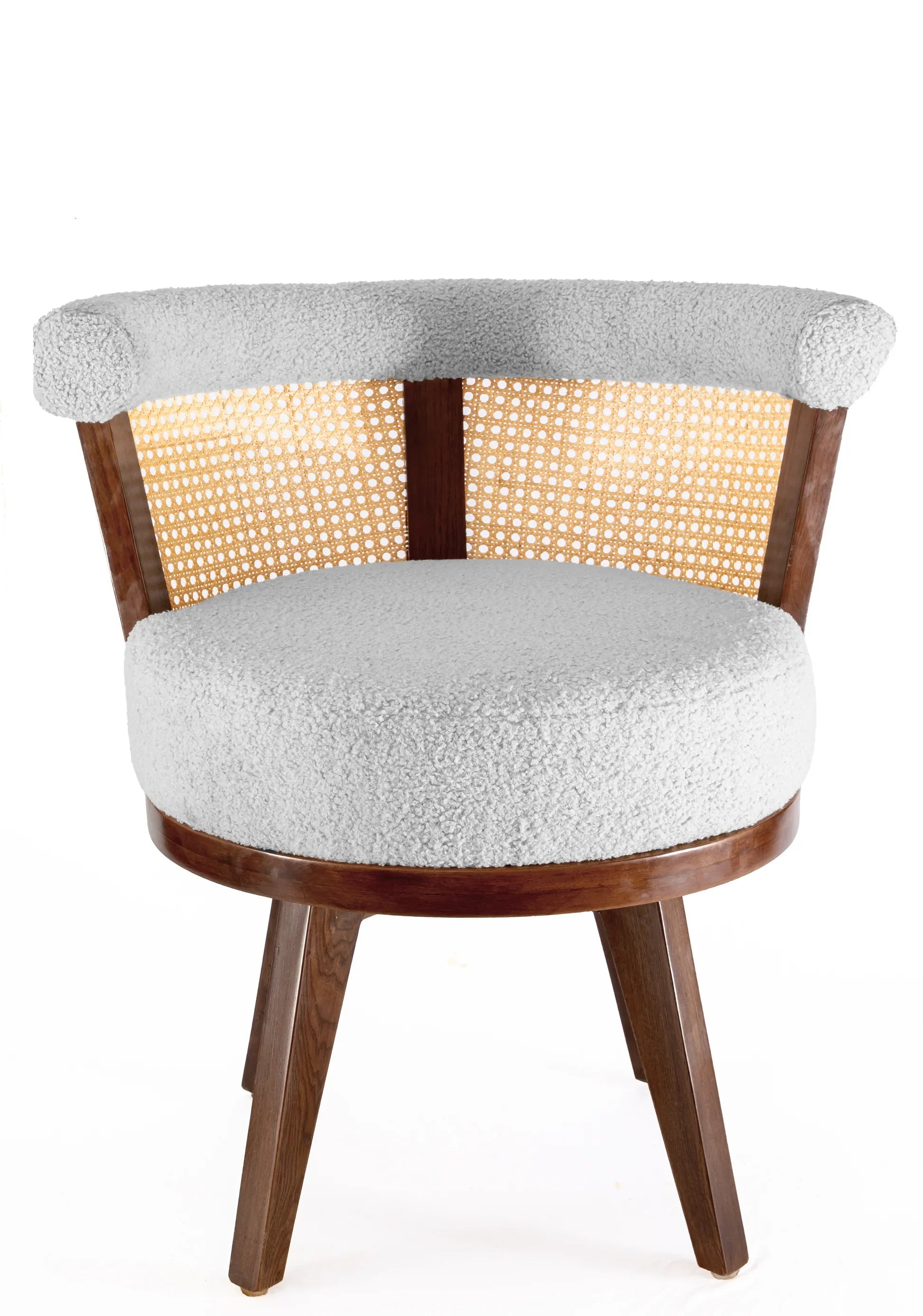 The Zen Swivel Chair is a compact and stylish seating option, featuring a natural rattan finish and upholstered in soft bouclee fabric. Its swivel base facilitates ease of movement, making it suitable for both work and leisure activities. The chair's sturdy construction and neutral color palette ensure that it is a versatile addition that will complement any room with a touch of warmth and sophistication.