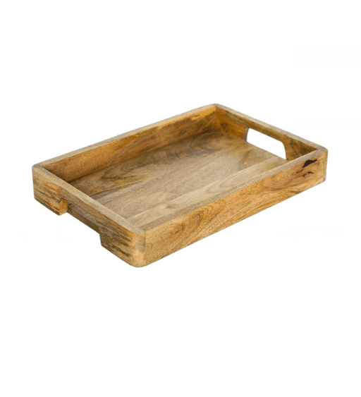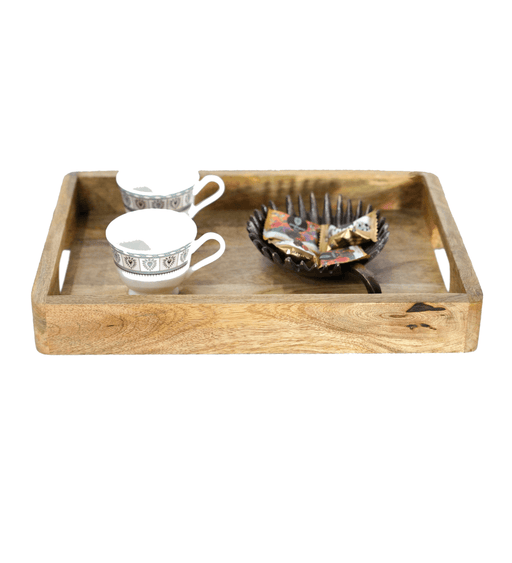 Mango Wood Medium Rectangular Wooden Serving Tray with Metal Handles - Decorative Breakfast Tray - Handcrafted Natural Wood