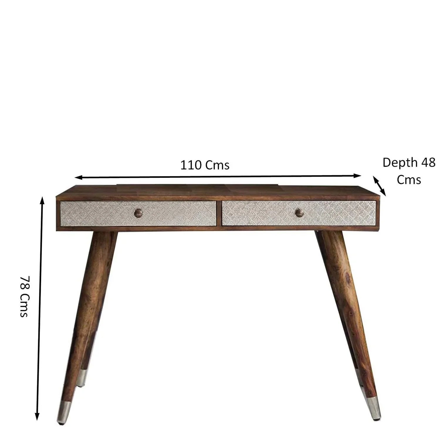 Our solid wooden study table specifically designed to modernize your study area. This furniture collection is must have in your study room. The desk or console table or office table or office desk is made in solid wood with a natural stain finish and well-detailed patterned laminate cladding on the drawers’ fascia. The knobs and legs’ base is in brass to add highlight and classiness to the furniture. Designed to suit all a home, office's needs, the desk features two spacious drawers to adjust your personal belongings. You can use it as a side table as well to your living room, bedroom, hallway or placed next to sofa.