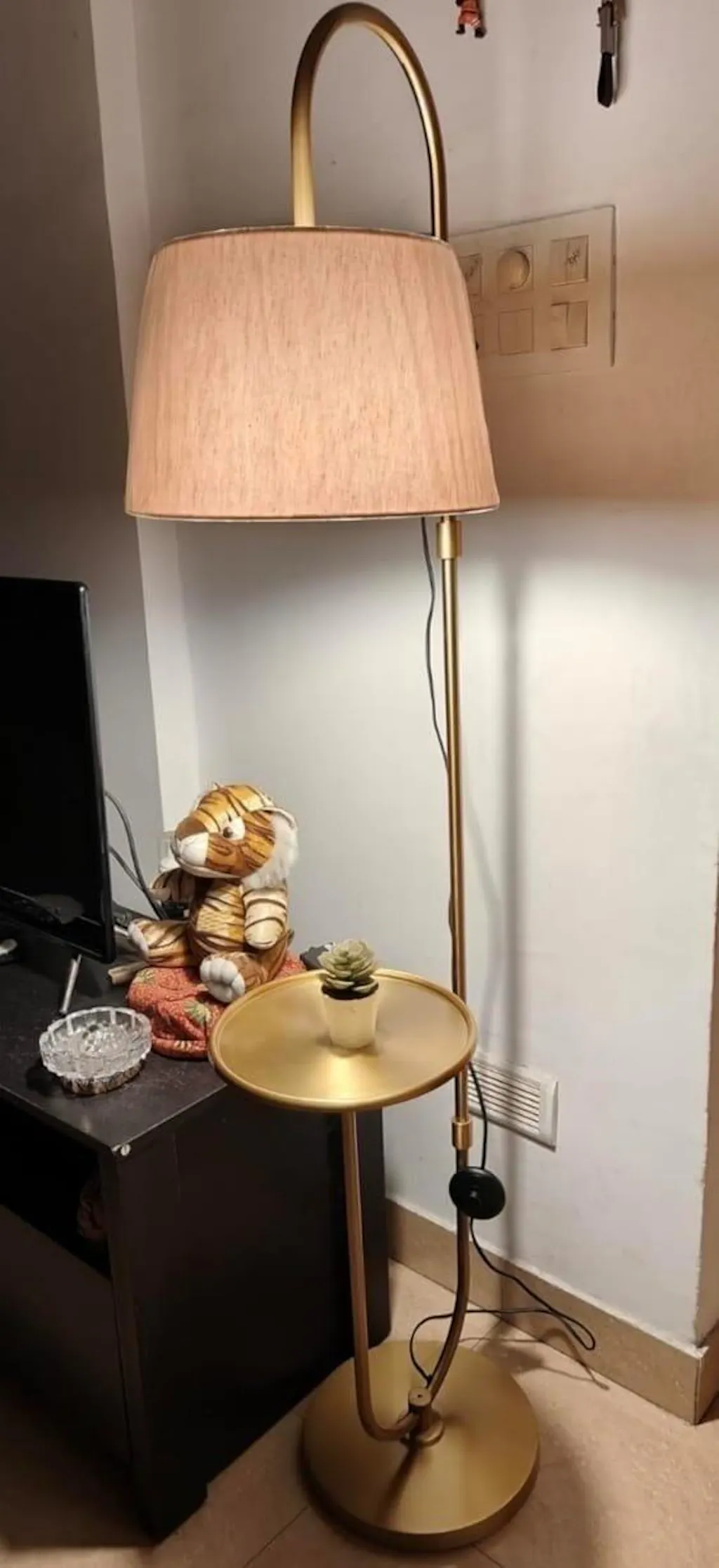 The Brass Antique Curved Floor Lamp with Table Shelf is a stunning addition to your home decor, combining elegance and functionality. Crafted from high-quality brass, this floor lamp features a unique curved design that draws attention while providing a perfect spot for books, remotes, or decorative items. Standing at 147.32 cm tall, it adds a vintage touch to any living room, bedroom, or office. Ideal for various settings, including cafes and hotels, this Standing Lamp for living room / living room floor lamps not only illuminates your space but also enhances its aesthetic appeal. Elevate your interior with this exquisite piece that seamlessly blends style and practicality.