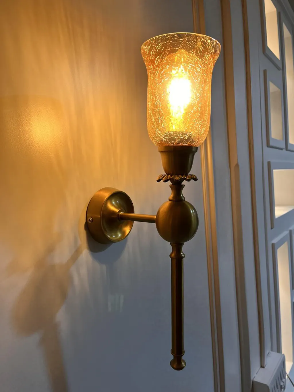 Brass Antique Finish Ball Wall Lamp with Chimney Crackled Glass Golden Luster Shade