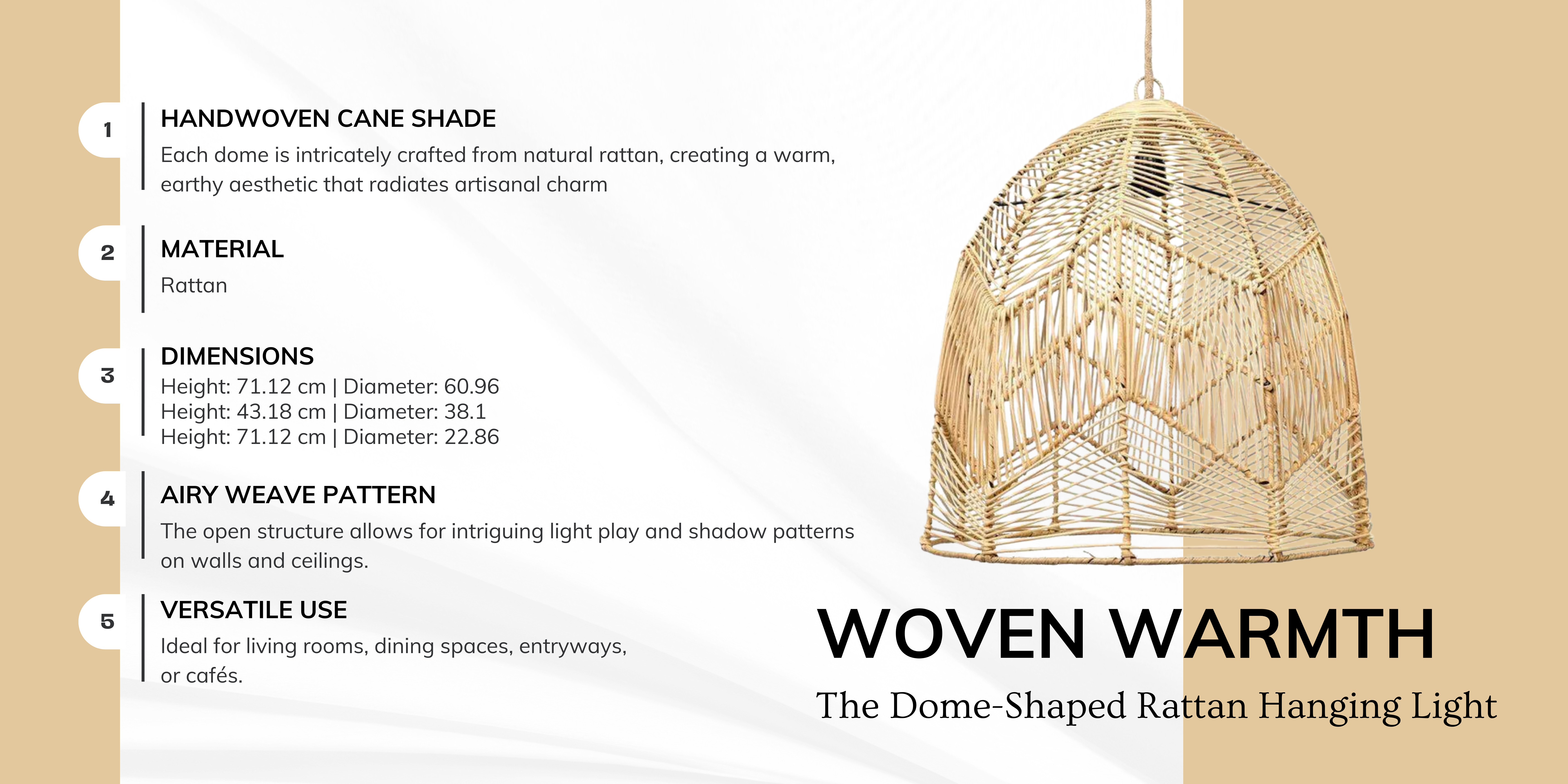 A beautifully handcrafted rattan pendant light that looks amazing in a bedroom, child's room, living space or covered patio. It is expertly crafted and hand finished to perfection ensuring quality. This rattan pendant light is a great way to add bohemian charm and warmth to your home and is perfectly adaptable to any ceiling height from your bedroom, kitchen island, or to a dining table or entryway. The uniqueness of our lampshades is given by the love and time dedicated by our artisans to carefully work each string of rattan to make our items. Its versatility makes it Ideal for any home decor from coastal to boho and rustic. Designed to add a warm, bohemian glow to your bedroom, living space, or office, this hanging light lamp is perfect for every corner. Carefully woven by artisans, this piece is ideal as ceiling hanging lights for living room, combining rustic charm with contemporary design.
