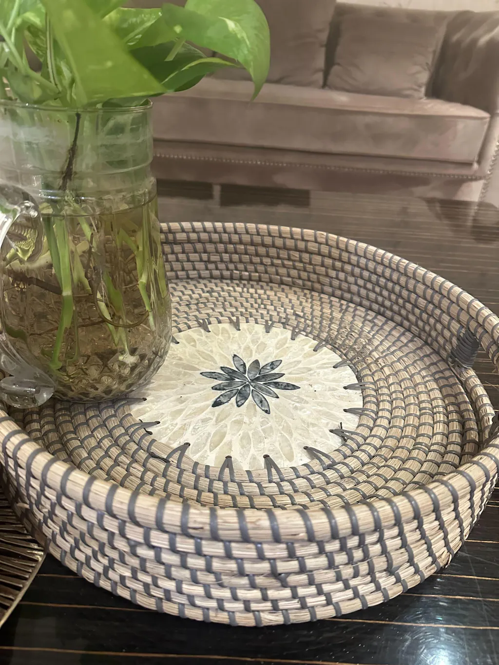 Natural Grey Seagrass Mandala Round Tray Basket with Handles For Home