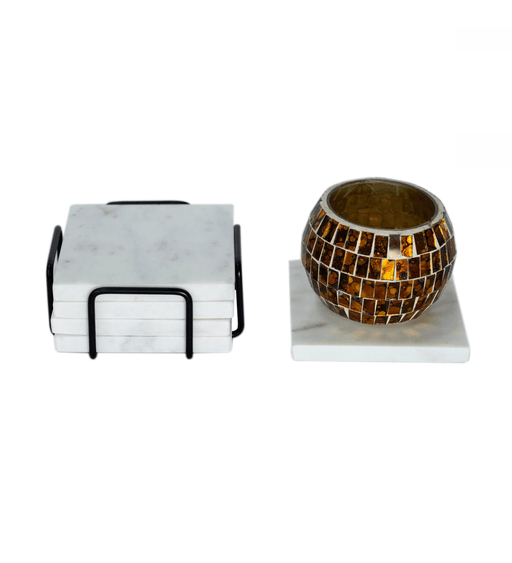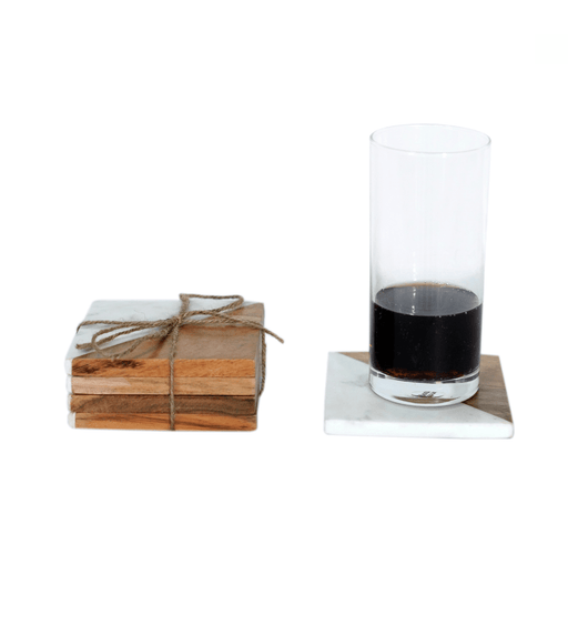 Unique White Marble and Wooden Tea/Coffee/Cocktail Coaster Set of 4 pcs, Table Decorative Cocktail Coaster (Square) Heat-Resistant Coasters for Hot & Cold Beverages