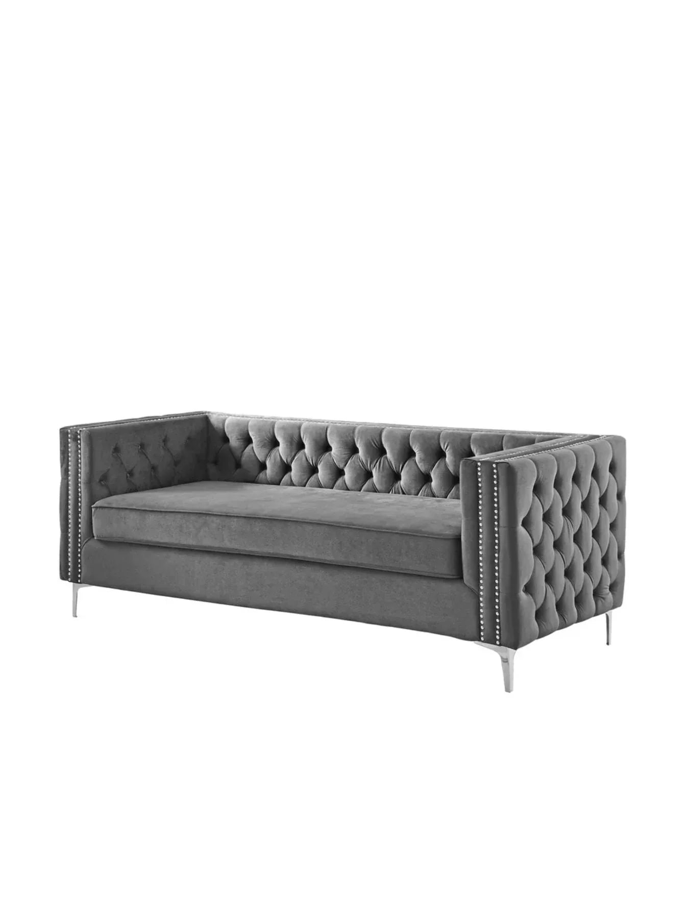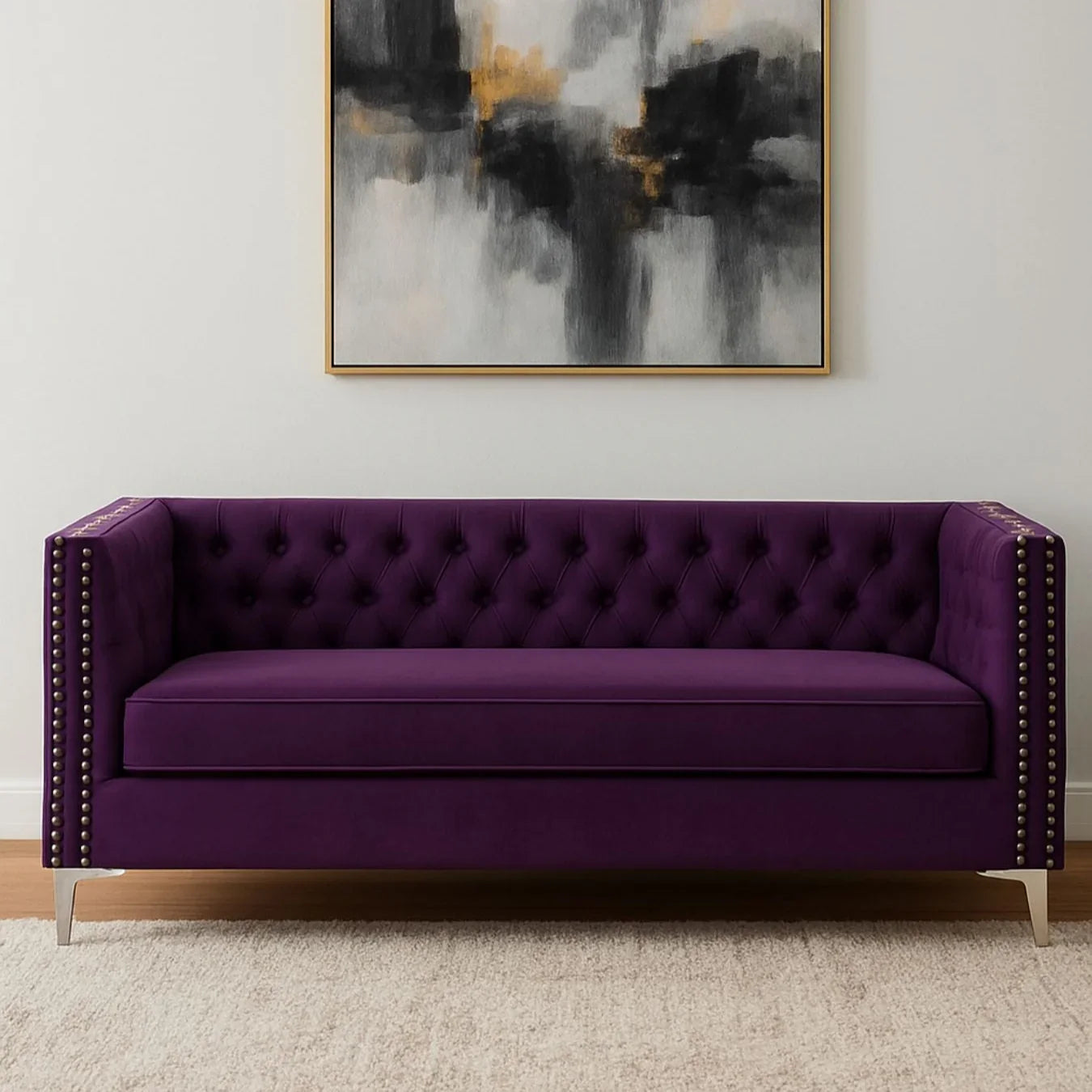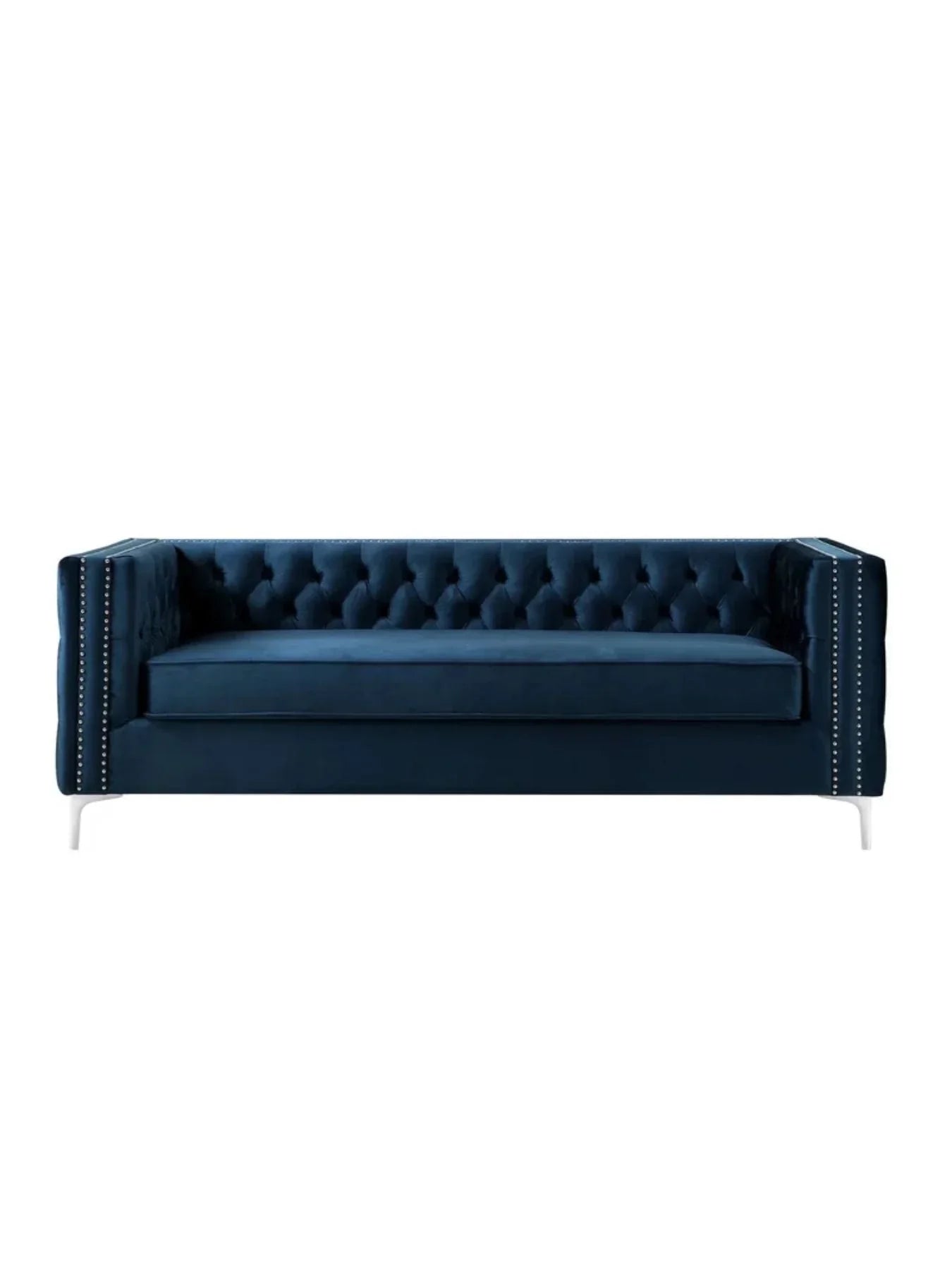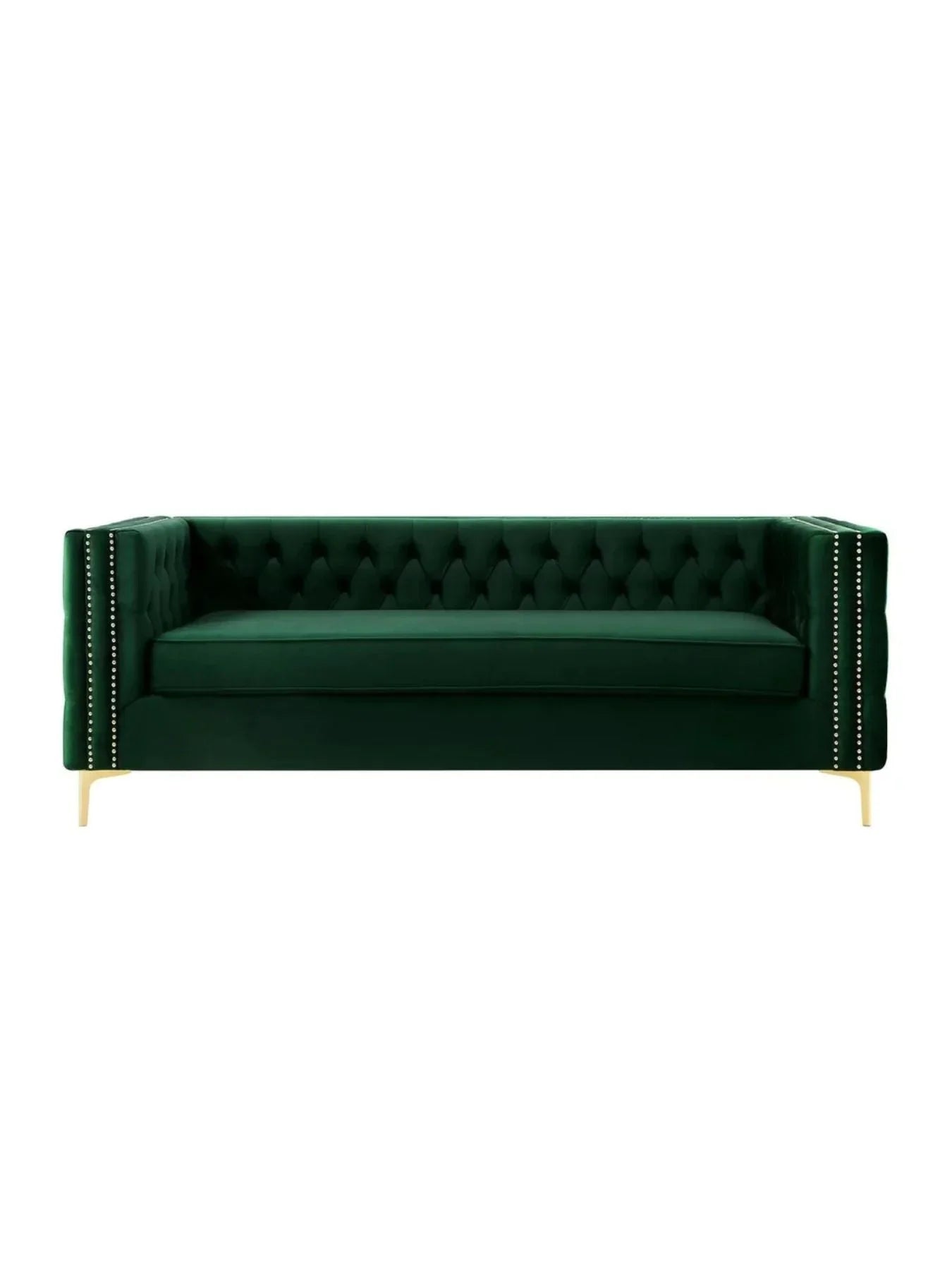 This elegant sofa combines comfort and style with its button-tufted velvet upholstery, clean square arms, and nail head trim detailing. The high-density foam seat provides lasting comfort, while the sturdy Y-shaped brushed metal legs add a modern touch. A perfect blend of traditional design and contemporary flair, it makes a striking addition to any living room.