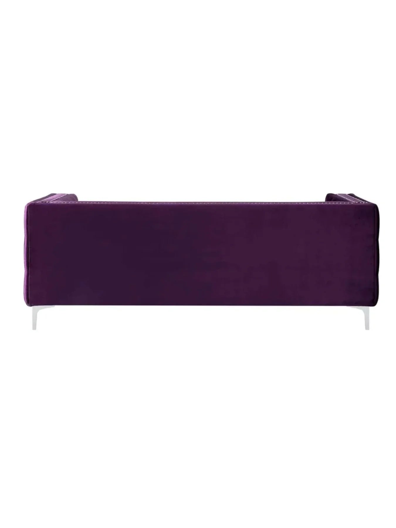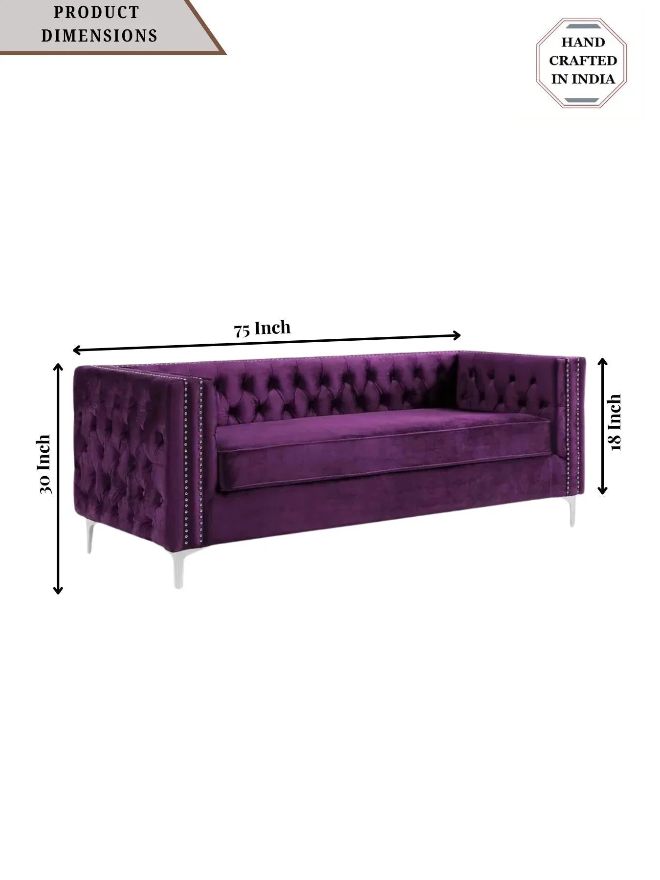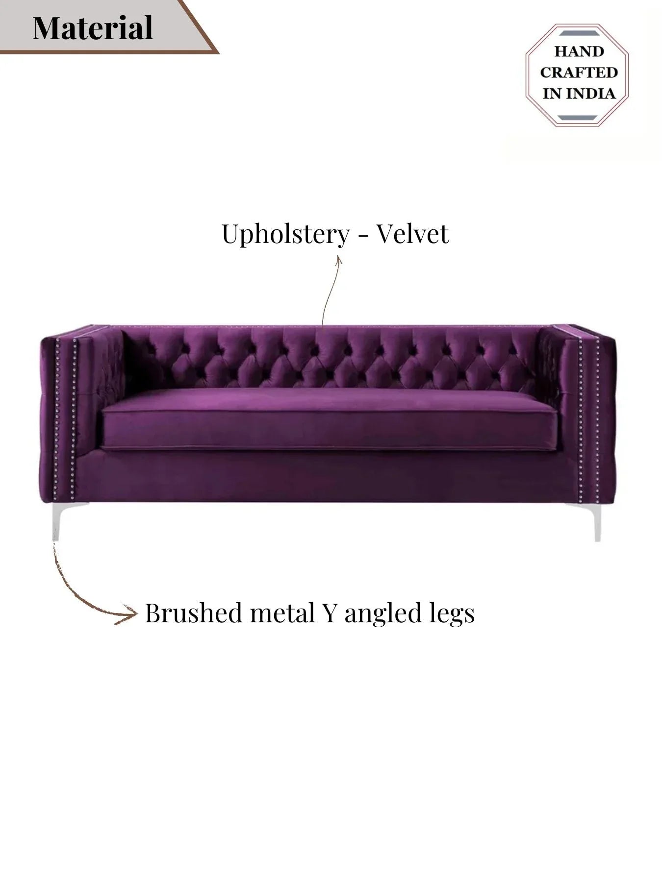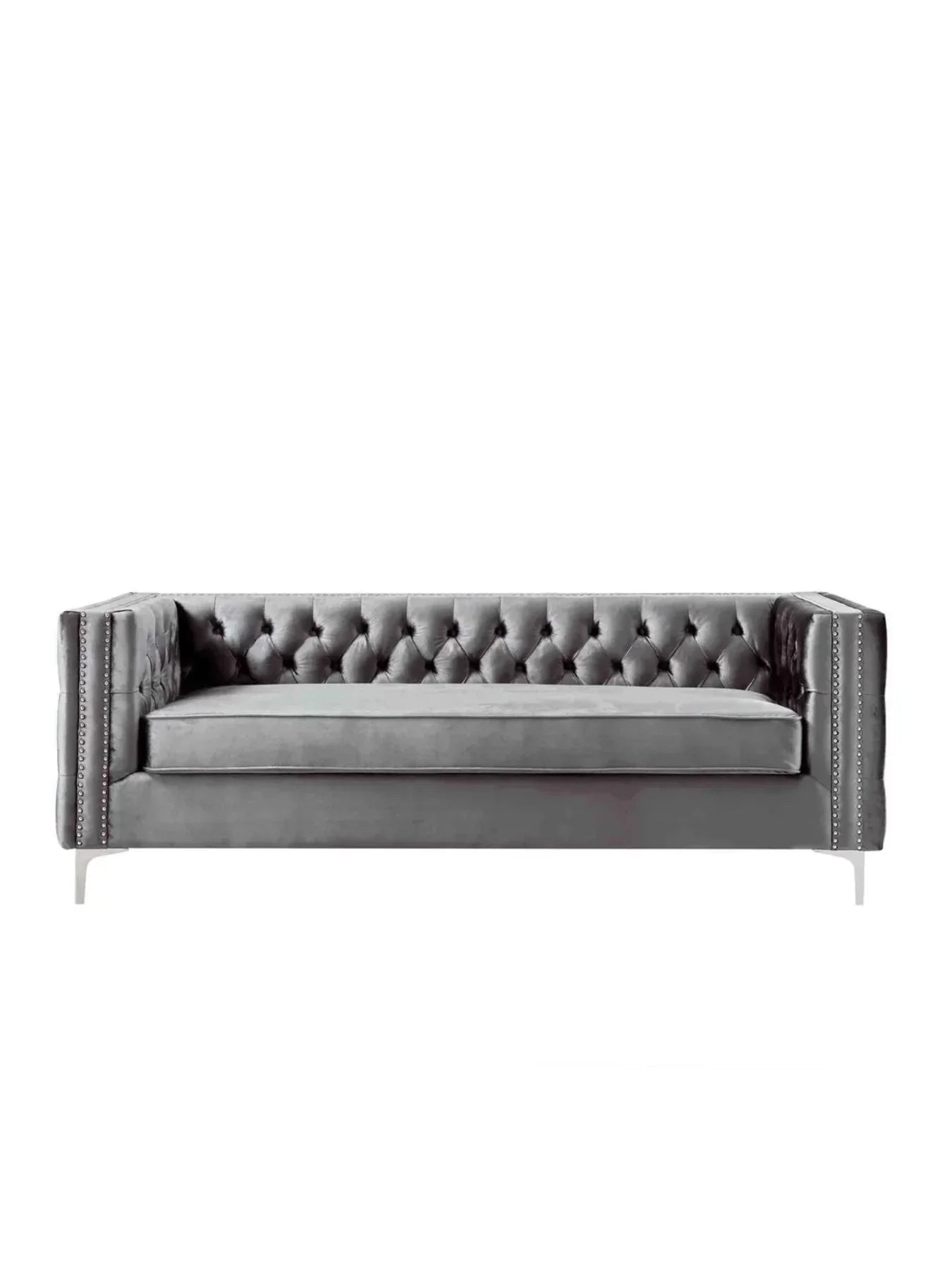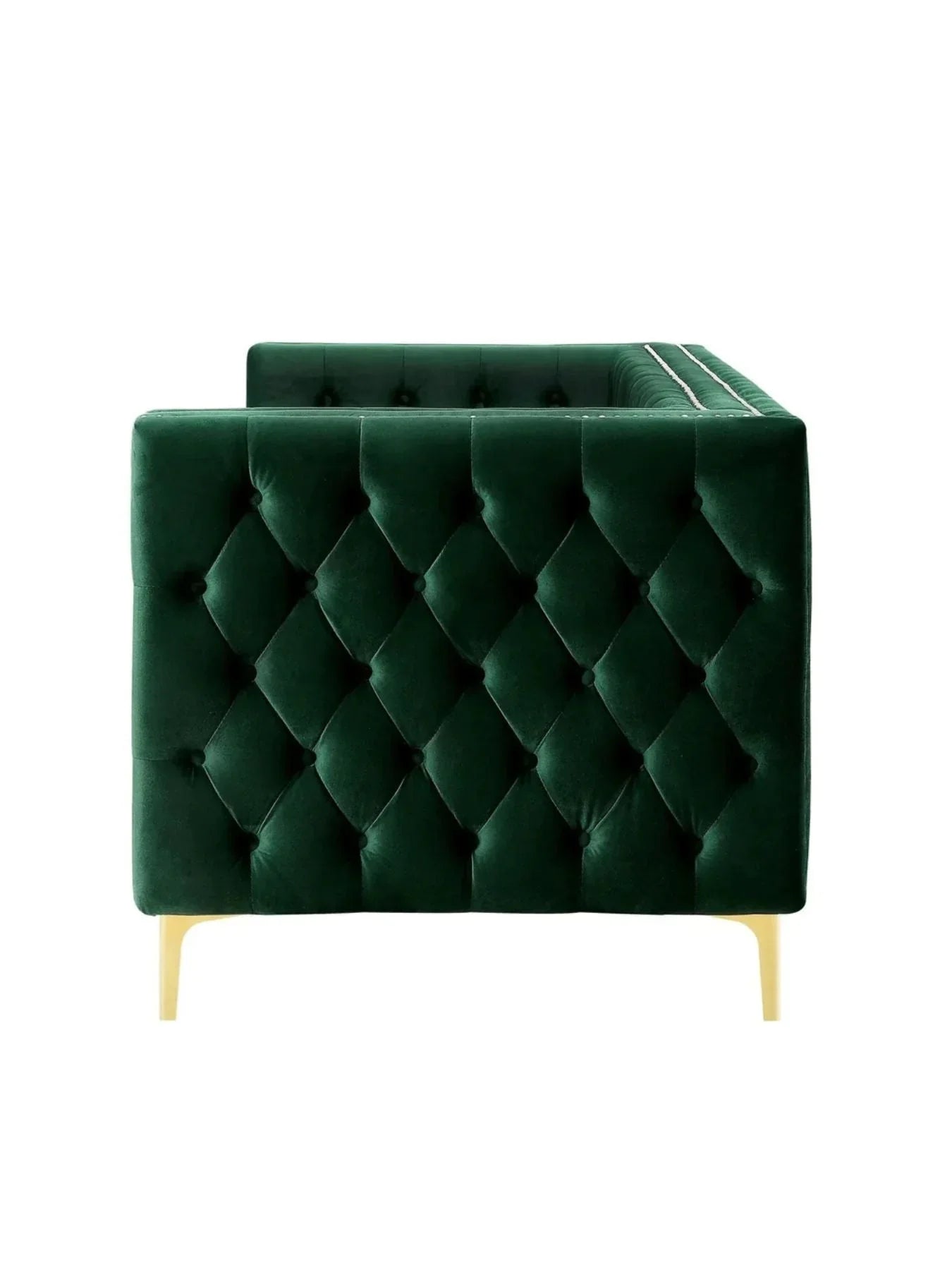 This elegant sofa combines comfort and style with its button-tufted velvet upholstery, clean square arms, and nail head trim detailing. The high-density foam seat provides lasting comfort, while the sturdy Y-shaped brushed metal legs add a modern touch. A perfect blend of traditional design and contemporary flair, it makes a striking addition to any living room.