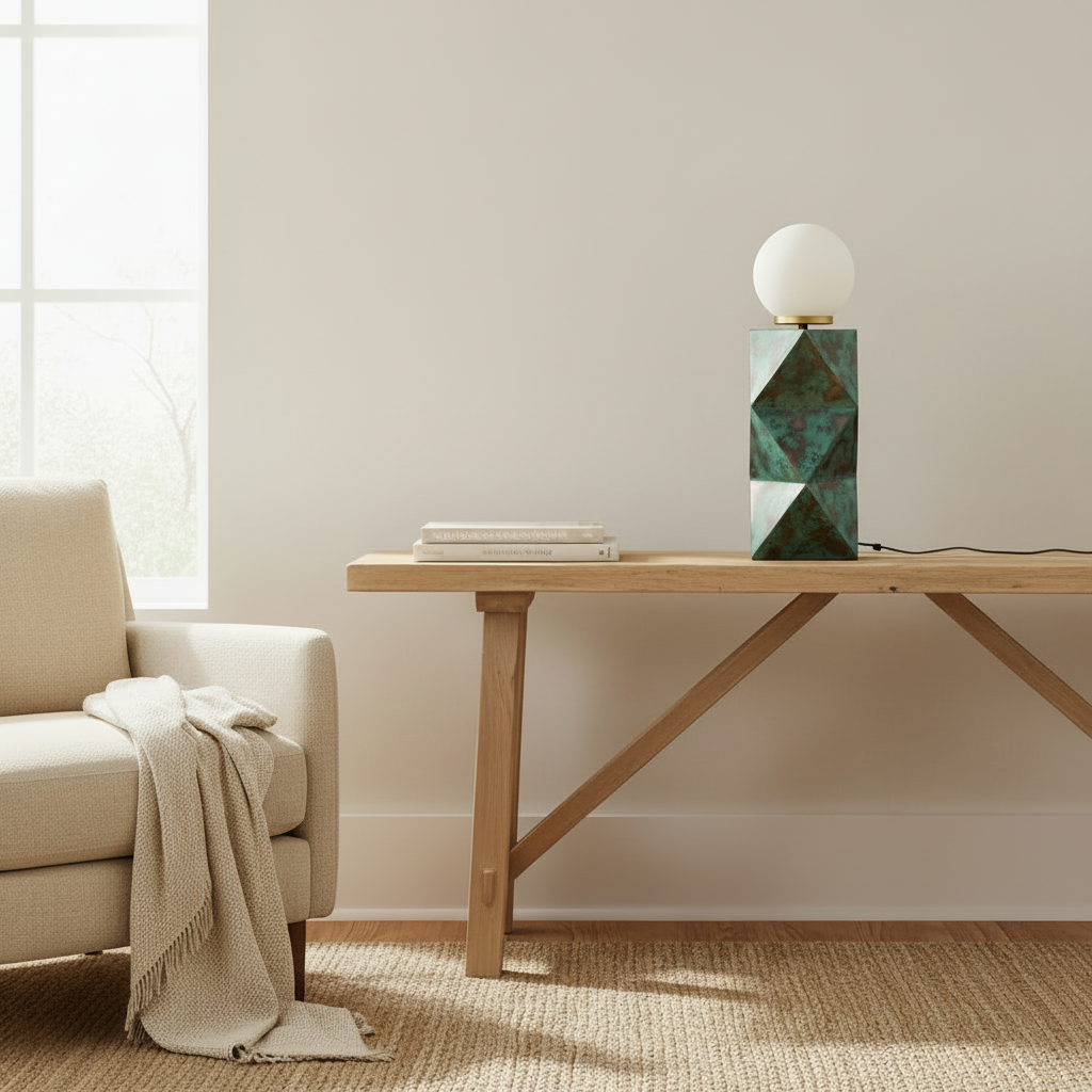 The Facet Table Lamp is a sculptural exploration of form, texture, and time. Inspired by the intricate geometry of crystals and the many planes that catch light from different angles, this lamp transforms the ordinary into something extraordinary. Each facet is thoughtfully shaped, reflecting the deliberate craftsmanship behind every edge, curve, and plane.