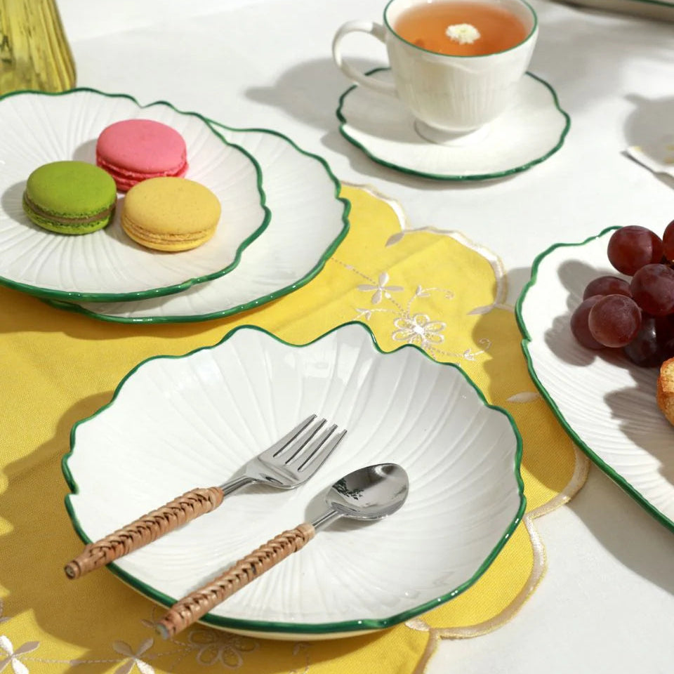 Enjoy your meals with understated elegance using the Edge of Evergreen Quarter Plate. Crafted in ivory with a delicate leaf texture and accented by a green rim, this plate blends natural inspiration with refined design. Perfectly sized for appetizers, desserts, or small servings, it adds a touch of timeless charm to every bite.