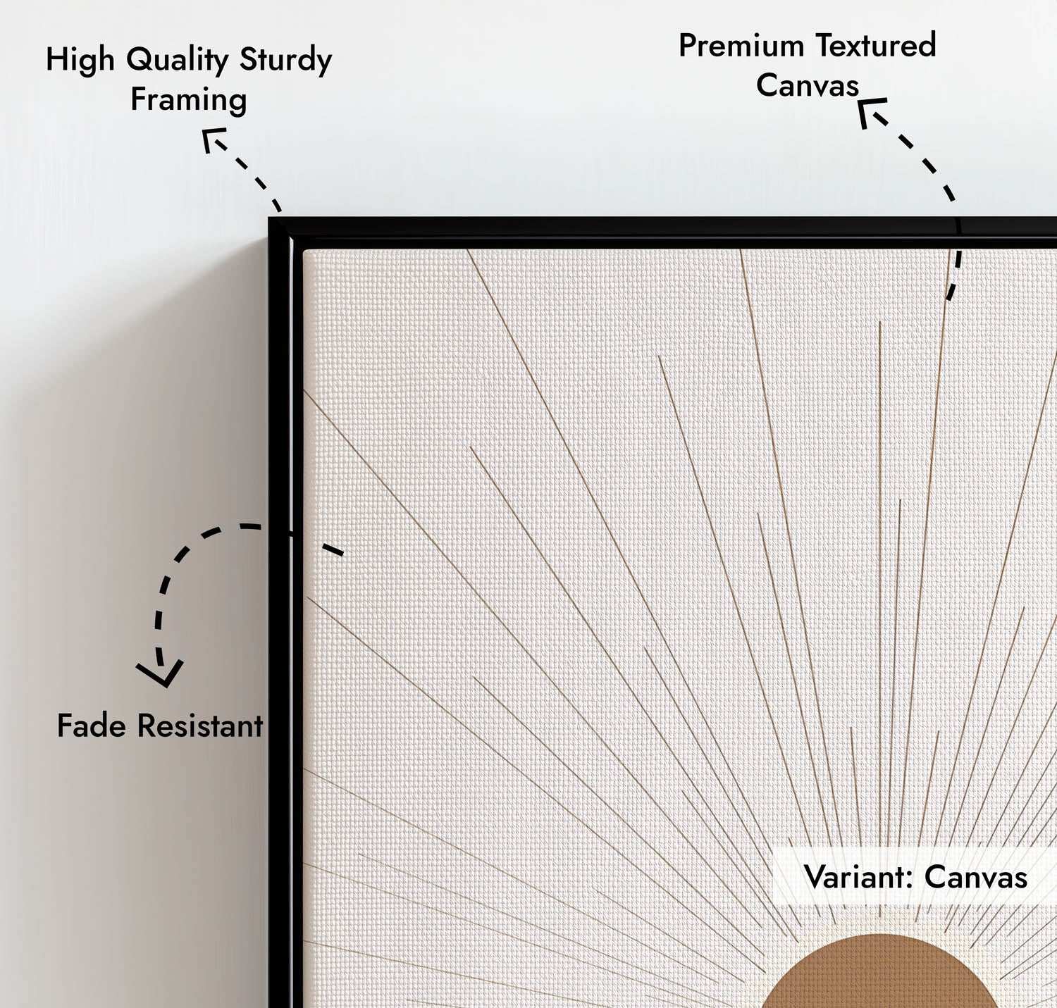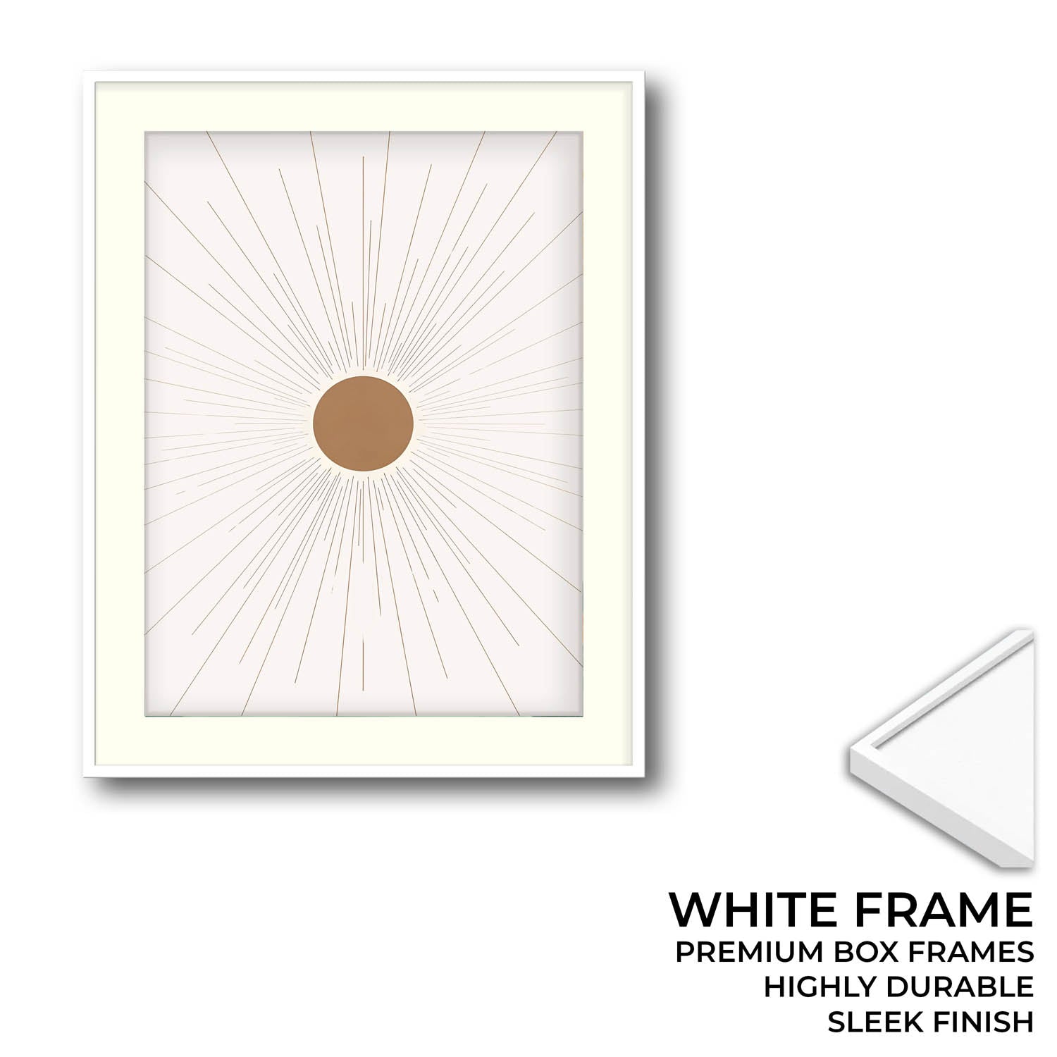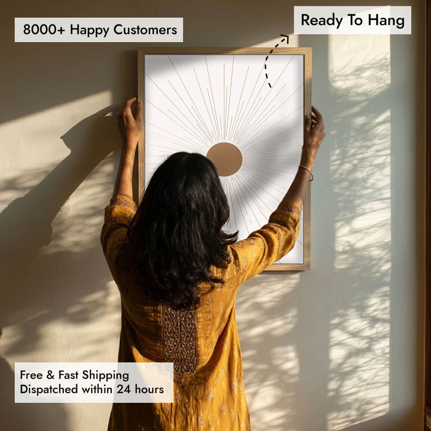 Radiant features a warm golden sun radiating fine minimalist lines across a clean, cream background. A modern symbol of light and energy, it adds brightness and balance to your boho or contemporary decor.