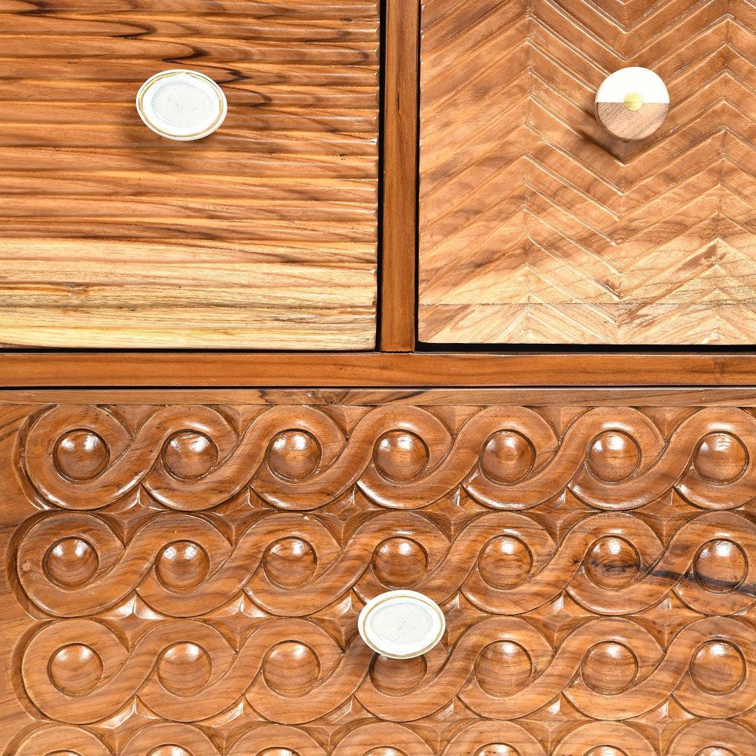Elegantly designed with a detailed hand-carved pattern front, the Amazon Media Unit features a simple yet clean, structured finish. A contemporary style, the unit is made in teak wood and plywood and has a chunky, wooden design along with beautifully finished ceramic knobs and a natural matt surface.