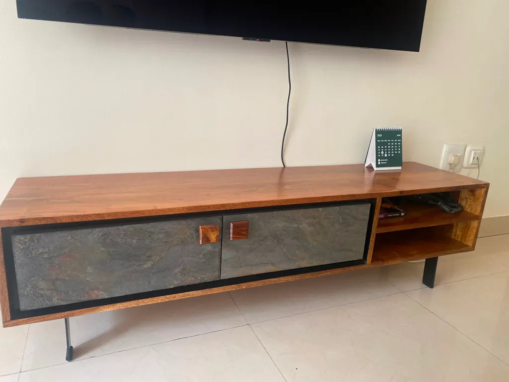 Our wooden TV unit is must have in your living space. Crafted using solid acacia wood, this TV cabinet ensures quality and durability. This wooden natural finished TV unit or TV stand is modernly designed to add perfection in your home decor. Its minimalist look and clear finish ensure it complements simple to stylish interior. This TV stand comes equipped with spacious cabinets providing ample room to store your DVDs, gaming consoles, remote controls, Crockery and other accessories. Its tabletop can be used to display decorative items, photographs, or art pieces. Elevate your living room or bedroom wall using our wooden TV unit TV stand!