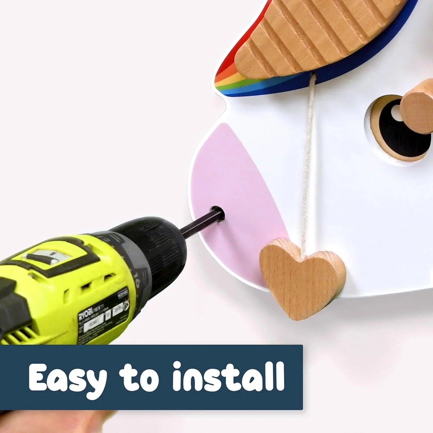 Unicorn Activity Wall Panel Toy is a beautifully designed educational toy that combines learning and fun. Crafted from premium MDF wood and coated with non-toxic, child-safe paint, this wall-mounted sensory toy enhances your child’s cognitive and motor skills while keeping them engaged. It features three interactive elements—a colorful bead maze, rotating gears, and a musical xylophone, making it an ideal addition to playrooms, Montessori setups, daycare centers, and preschools.