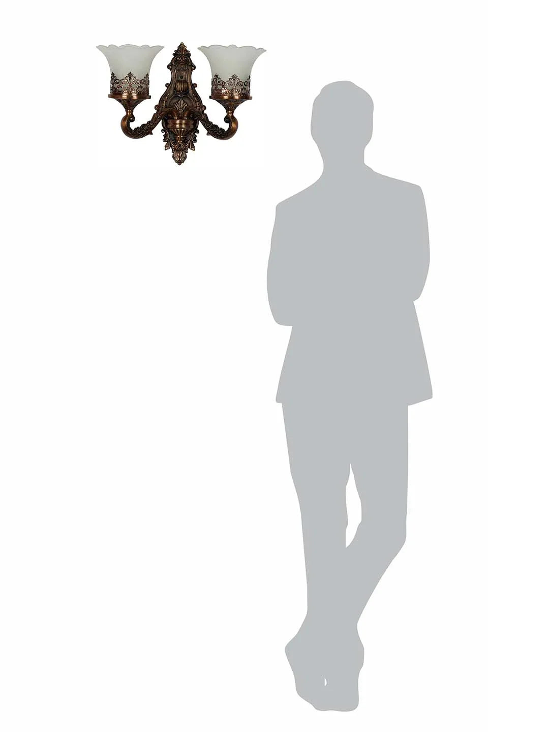 This classic double-light wall lamp is constructed from cast aluminium and comes in an antique copper finish. It features two glass shades on a designer hand-carved base with dainty detailing that is a result of excellent craftsmanship. A perfect fixture to add enough lighting to your space and gives its viewers a luxurious sight that will create a pleasant atmosphere. It will work wonders in your dining room, hall, or bedroom.
