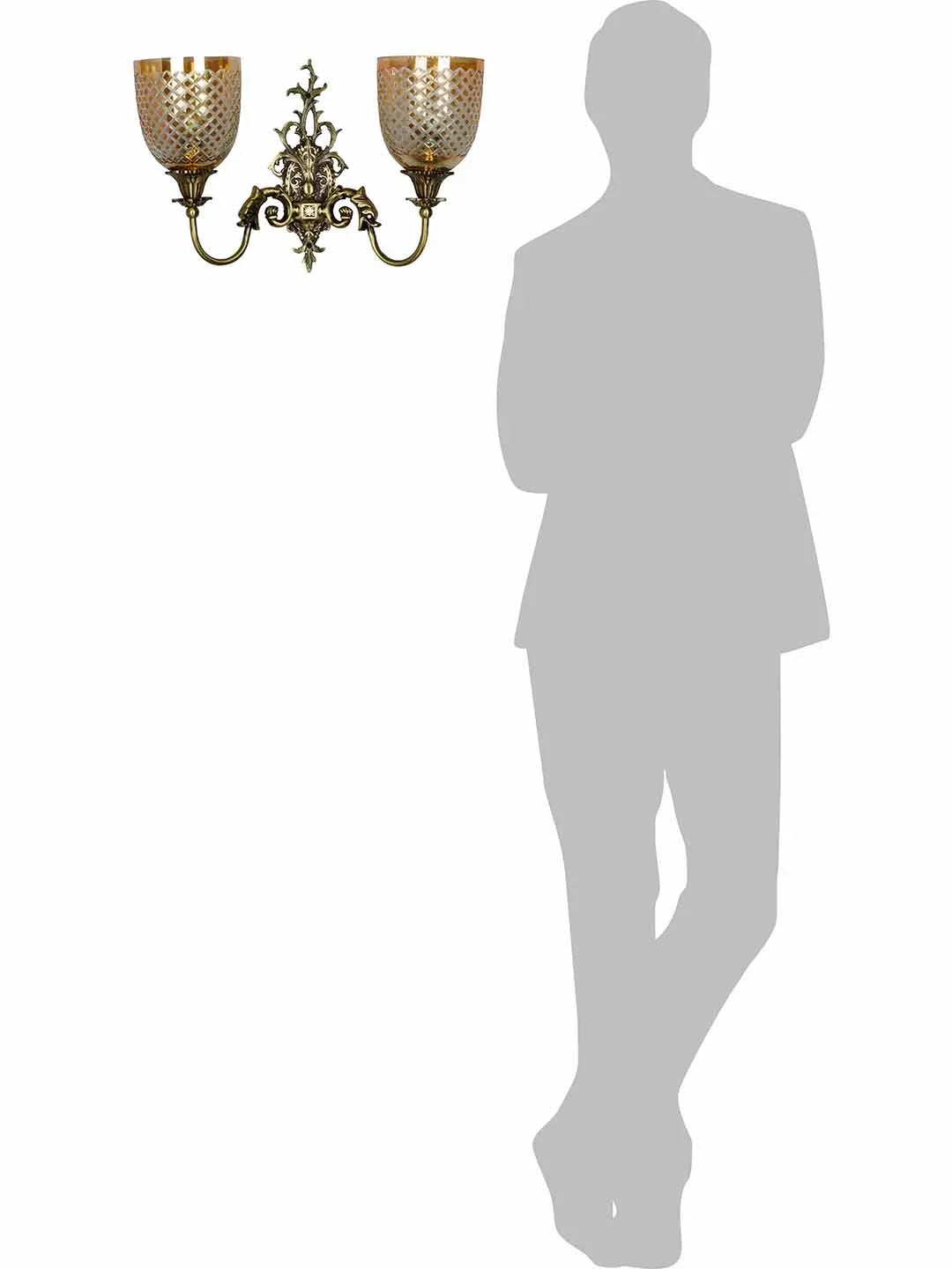 Embrace the timeless elegance of the FishBrass-TrophyLust-WL2 wall sconce. This captivating fixture features a classic design, boasting an antique brass finish that adds a touch of sophistication to any space. The ornate base showcases a mythical fish or dragon design, crafted from solid brass with the same beautiful finish. Its mouth holds an S-shaped pipe arm that extends upwards. Atop the arm sits a cast bobeche that supports stunning diamond hand-cut golden luster glass shades. This unique wall sconce is a perfect conversation starter and adds a touch of nautical flair to hallways, living rooms, or entryways. A single sconce variation (SKU: FishBrass-TrophyLust-WL1) is also available for a grander statement.