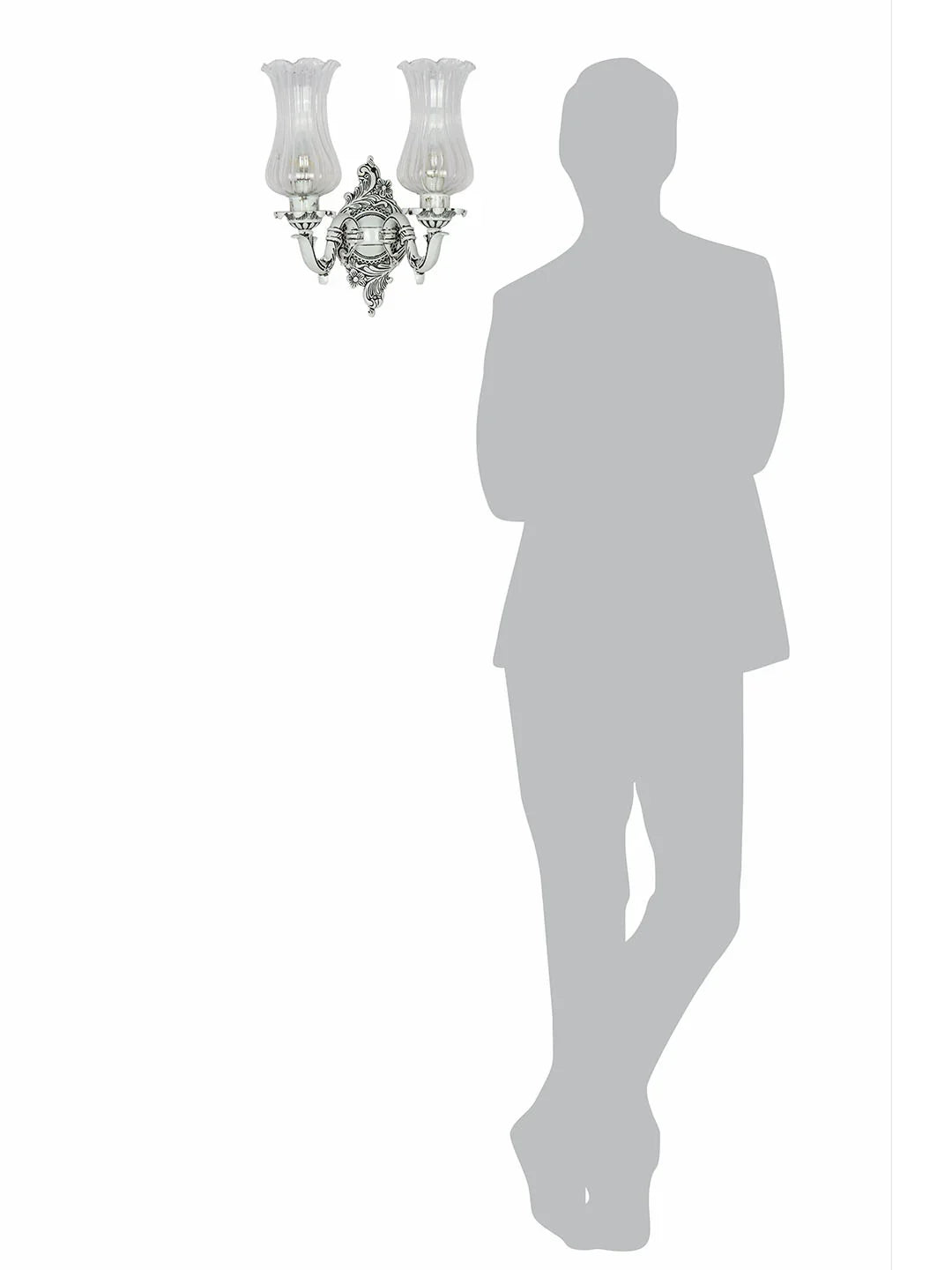 Elevate your space with our exquisite Swan Double Wall Lamp, a symbol of timeless elegance. Crafted from cast aluminium with ornate carvings, this double wall lamp features an antique white finish, accentuated by subtle black details in the grooves. It comes adorned with two fluted borosilicate glass shades that cast a warm, inviting glow. Perfect for adding a touch of grace and style to your home
