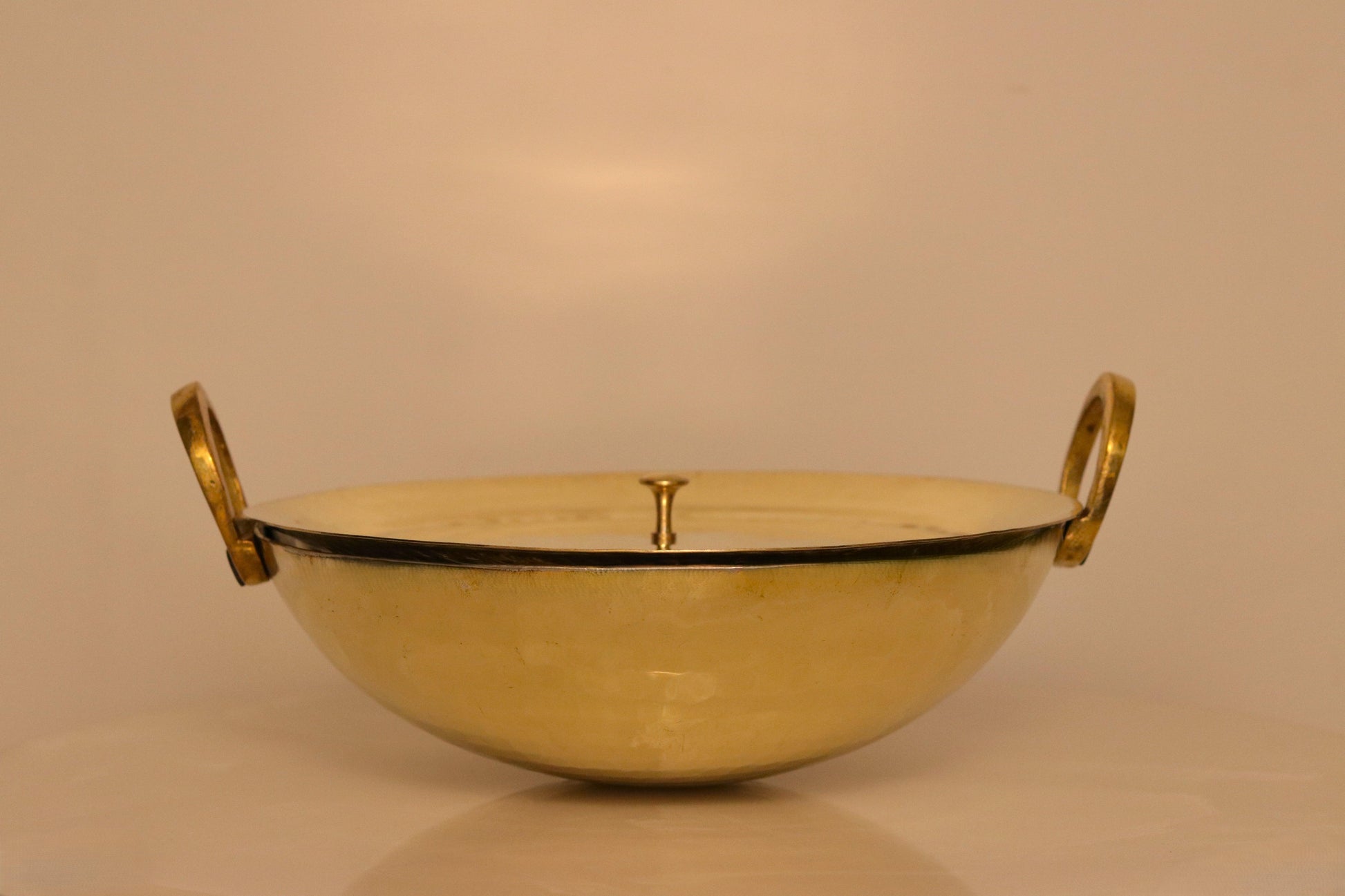Elevate your cooking experience with our Brass Kadhai with Handle, a must have cookware for your kitchen. This pital non stick kadai is perfect for preparing and serving delicious Indian dishes like daal and curry. Crafted from golden pure brass, this heavy weight kadhai ensures even heat distribution, enhancing your culinary skills. The sturdy handle provides a secure grip, making it easy to maneuver while cooking. Whether you're sautéing, frying, or serving, this brass kadai combines tradition and functionality, adding a touch of elegance to your kitchen. Embrace the art of Indian cooking with this beautiful and durable kadai today!