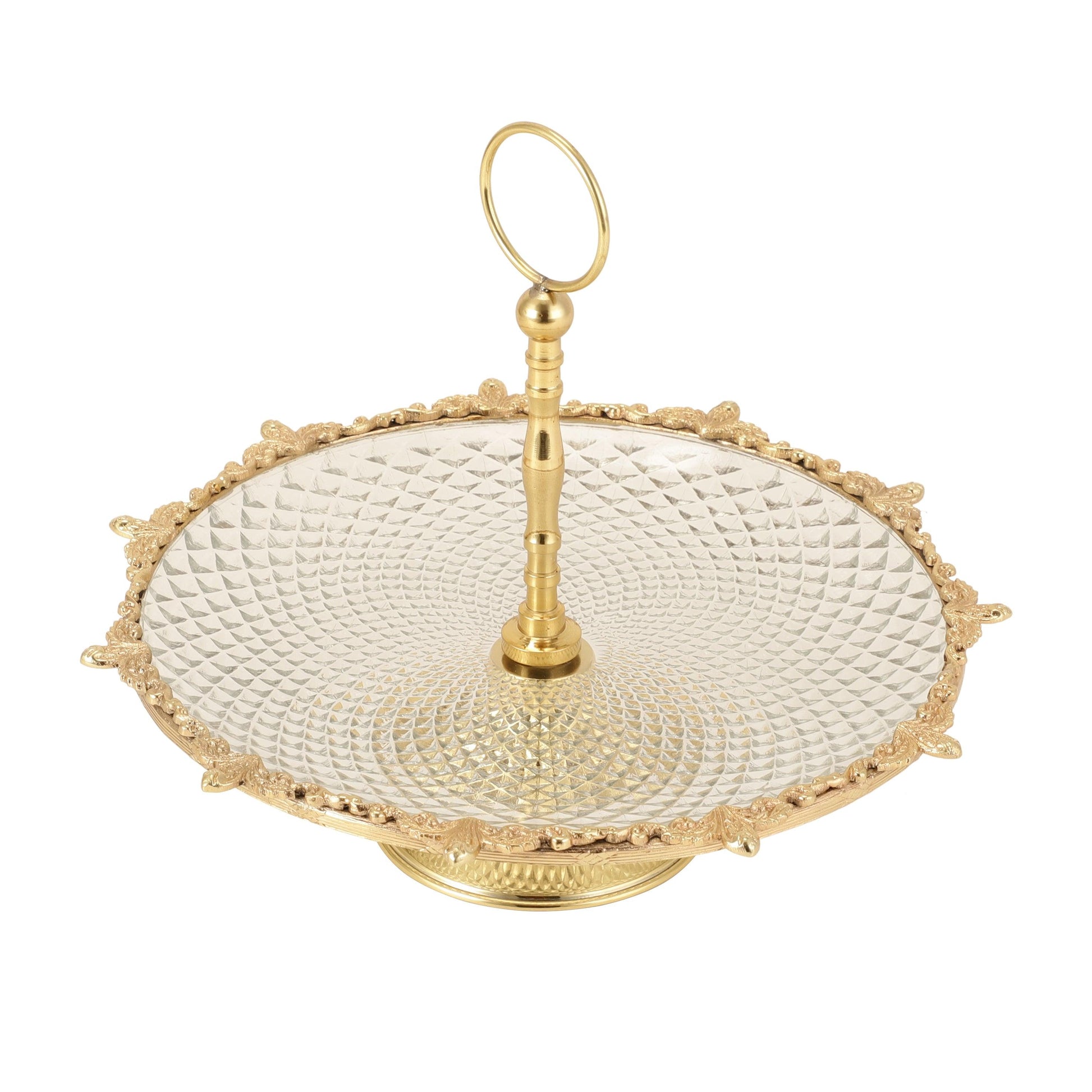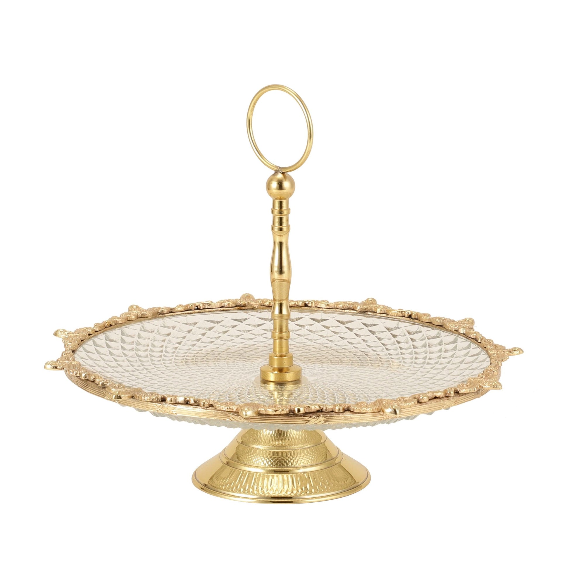 the Crystal Spike Cake Stand, a stunning showcase for your culinary creations. This elegant stand features a single layer of crystal glass adorned with spiky diamond-shaped cuts, creating a mesmerizing display. With its brass accents adding a touch of sophistication, the Crystal Spike Cake Stand is the perfect centerpiece for showcasing desserts and treats in style.