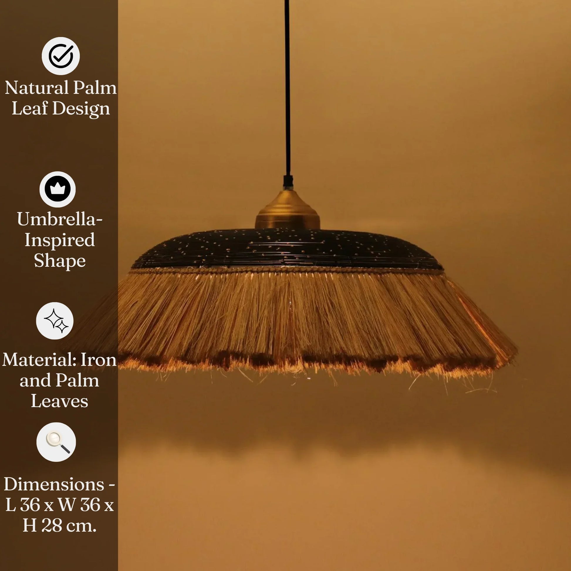 The Parasole Medium Hanging Lamp is a fun and unique piece of decorative lighting that looks like an umbrella and is made from palm leaves. It's perfect for adding character to your home or business decor. Use it as kitchen pendant lighting, a light for home decor, or as a ceiling light for living room. This hanging pendant light also works well as a light for the dining table or outdoor hanging lights. Its whimsical design makes it a great hanging light fixture, modern pendant lighting, or unique pendant light. The wired pendant light and pendant lampshade create a stylish and enchanting atmosphere.