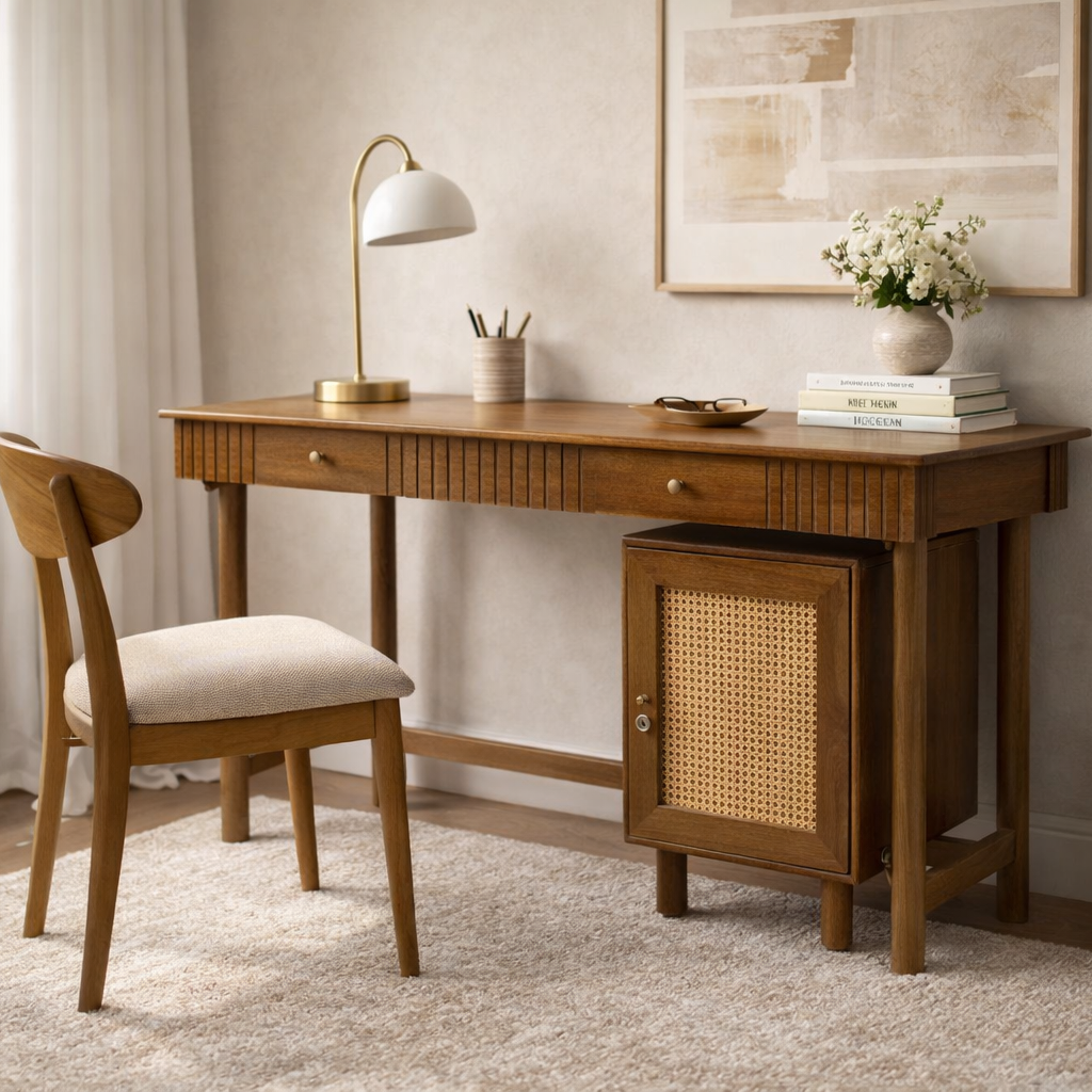 Desk with 2 Drawers and a separate storage cabinet, with aesthetic improvised by using cane.