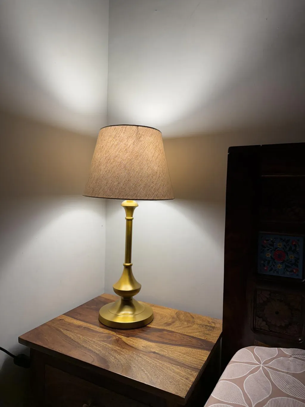 The brass table lamp with off white lampshade is not only a piece of art but also an addition to your home. This side table lamps is perfect for every nook and corner of your living room, study and bedroom. The lampshade/ study table lamp is made of premium quality fabric that diffuses light evenly, creating a beautiful and warm ambiance. It will seamlessly blend in with any decor style. The brass finish of the side table lamp/ night lamp for bedroom/ home decor lamps is graceful, and it complements the stylish lampshade, making it perfect for your home. So why wait? Get your brass side table lamp with off white lampshade today and upgrade your home's ambiance with its warm radiance.This side table lamp\ desk lamp is perfect choice for a modern home decor, living room, bedroom, drawing room, and any side space.