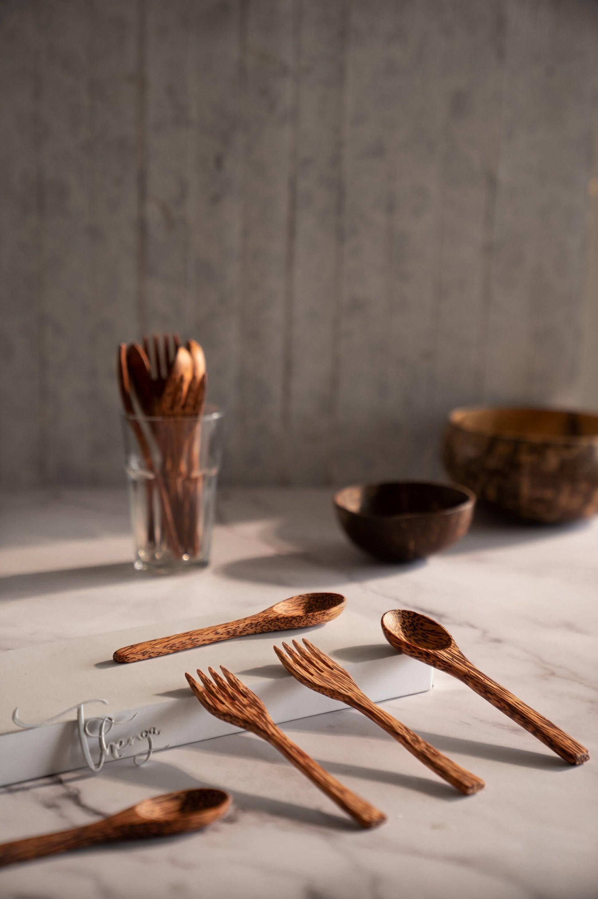 Upgrade your cutlery collection today and savor every moment with our Coconut Wood Spoon & Fork Set – where style meets sustainability. Each piece is carved from sustainably sourced coconut palms, making them a stylish addition to your kitchen. The set contains 2 spoons & 2 forks. This cutlery set is a classy piece to elevate your dining experience and table decor. The rich brown tones of the coconut shell add warmth and character to your table setting, making every meal a delightful experience. Our coconut shell cutlery is not only aesthetically pleasing but also eco-friendly. It is perfect for everyday use. Whether you're enjoying a casual family dinner or hosting a special gathering, these spoons and forks are versatile enough to complement any table setting.