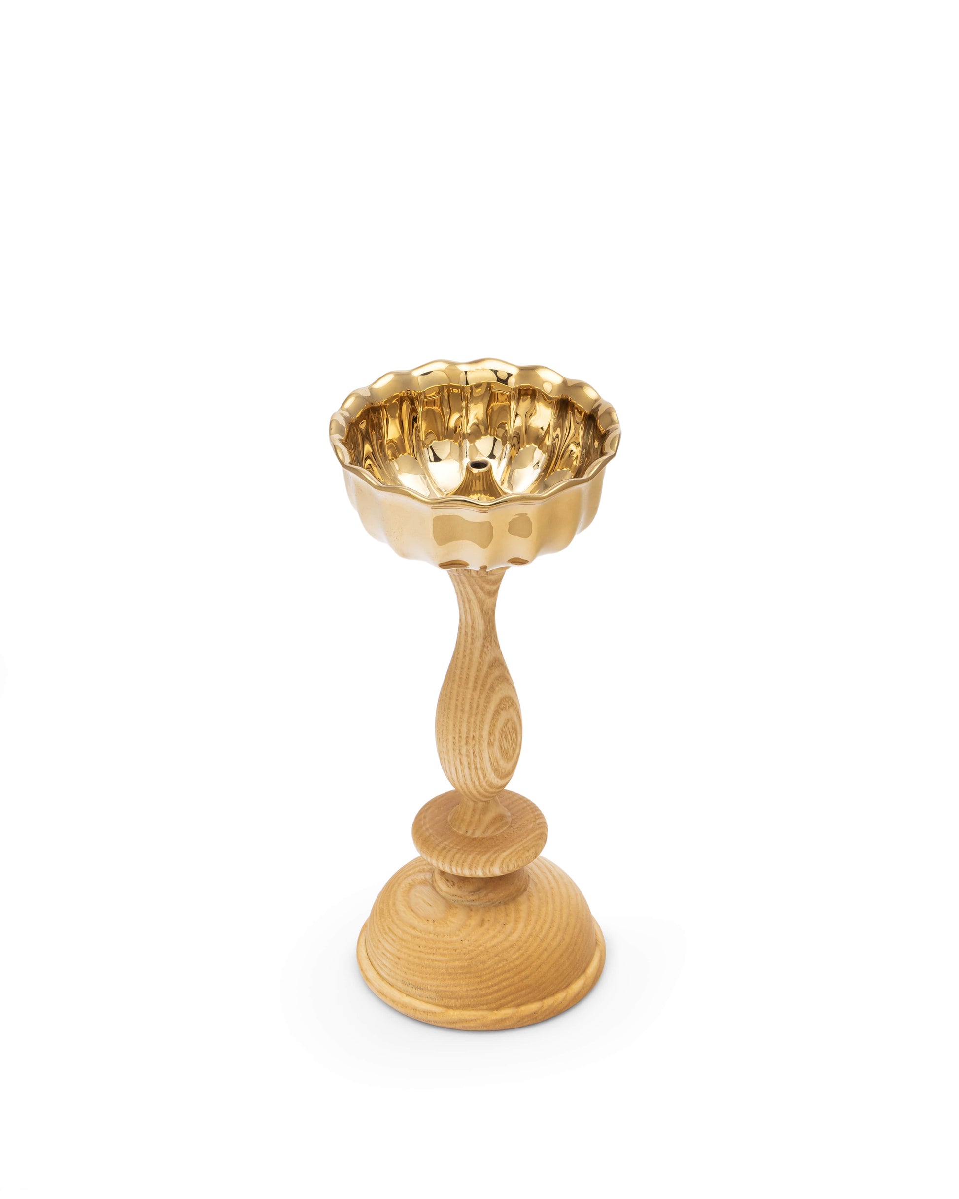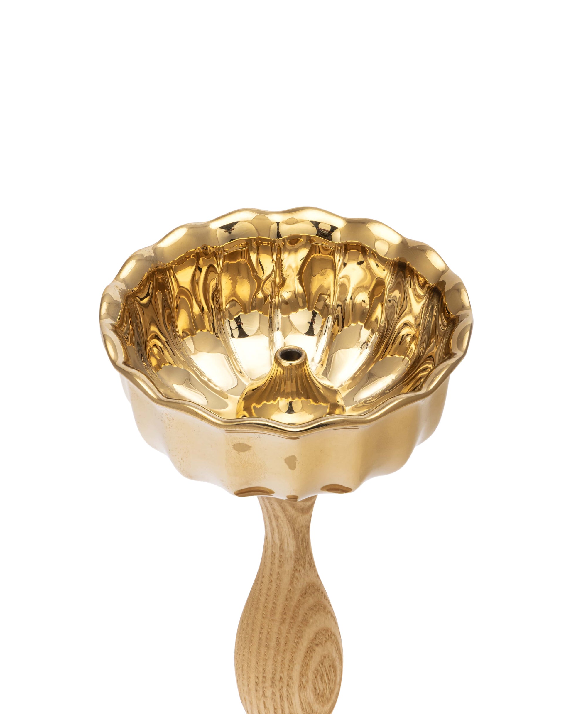 Crafted from cast brass with a long-lasting PVD coating to resist tarnish, it rests on a white oak wood base treated with an oil finish to enhance its natural beauty.