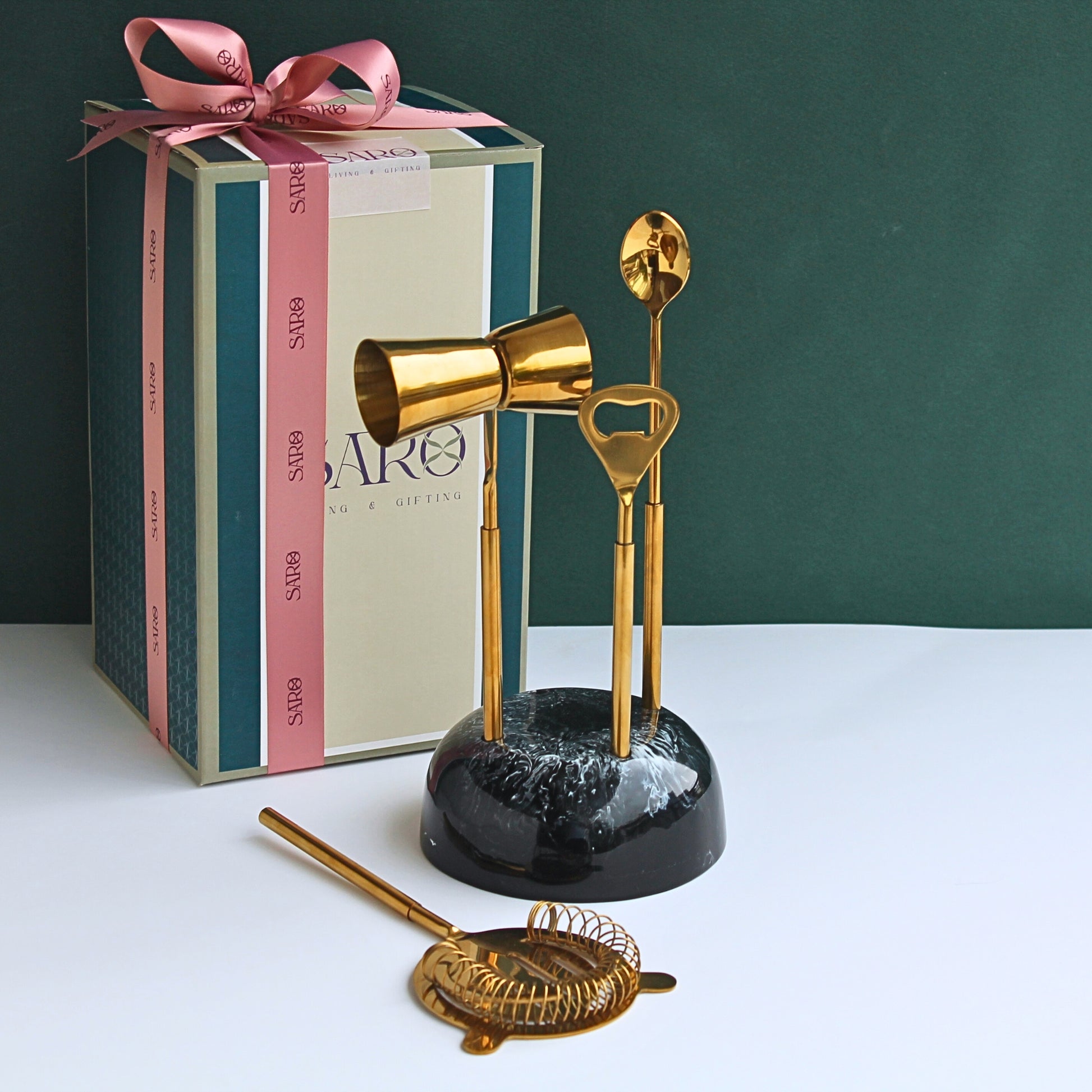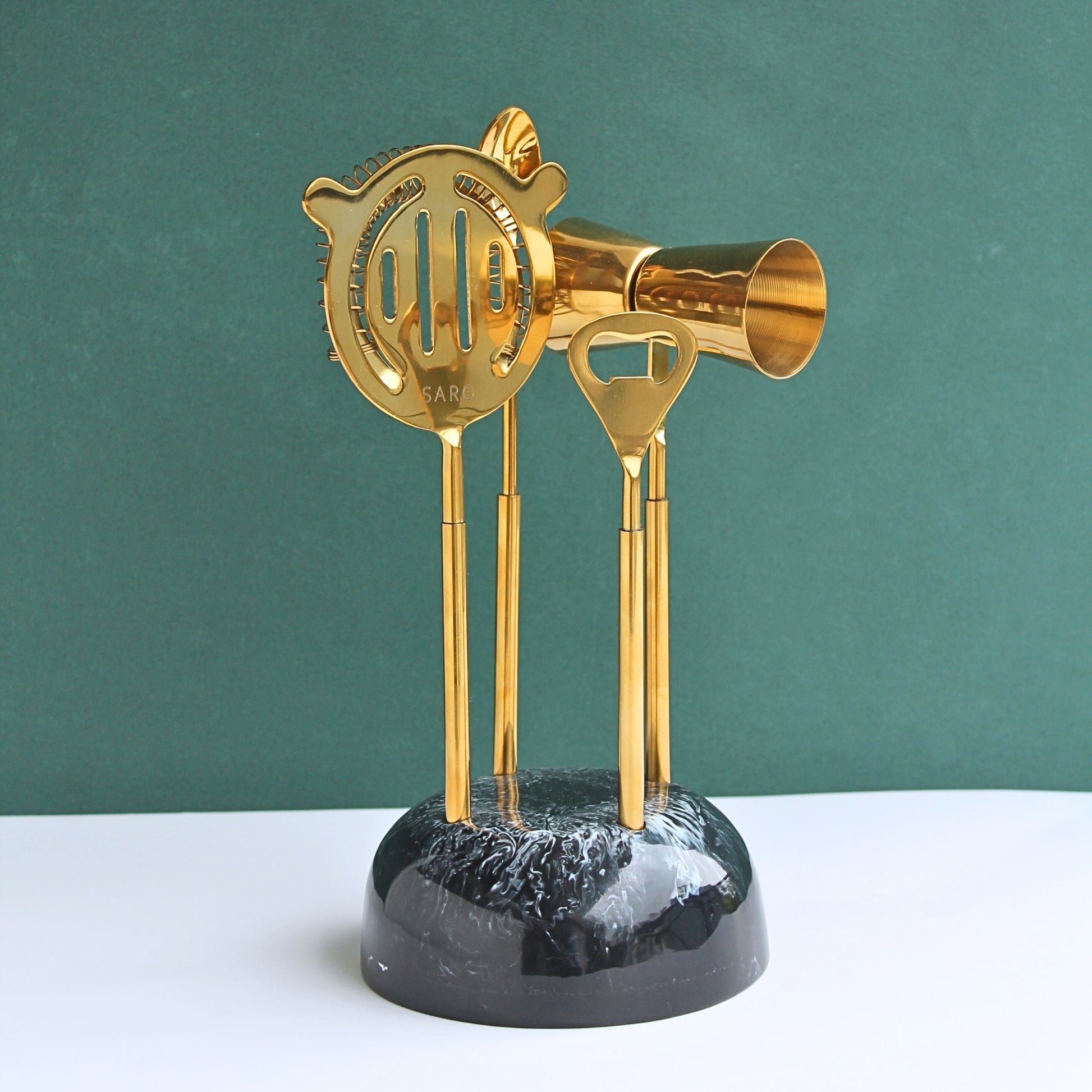 Elevate your cocktail rituals with Dome Bar Set, a striking blend of modern design and timeless sophistication. Featuring gold-finished stainless steel bar tools elegantly mounted on a black and white marble finish dome-shaped resin base, this set is as much a conversation starter as it is a mixology essential. Designed for the discerning host, the set includes a strainer, bottle opener, peg measurer, and stirring spoon, making it the perfect companion for crafting classic cocktails or experimenting with new blends. Its sculptural form doubles up as a decor accent for your bar counter or sideboard.