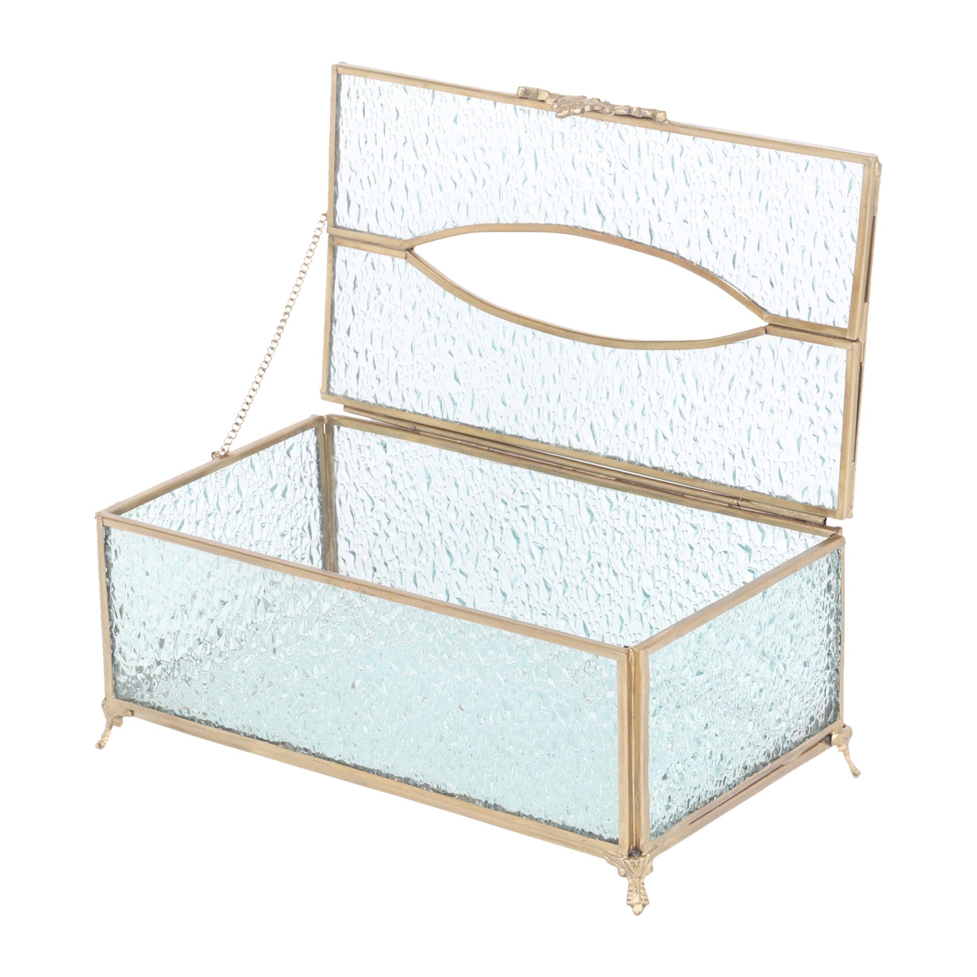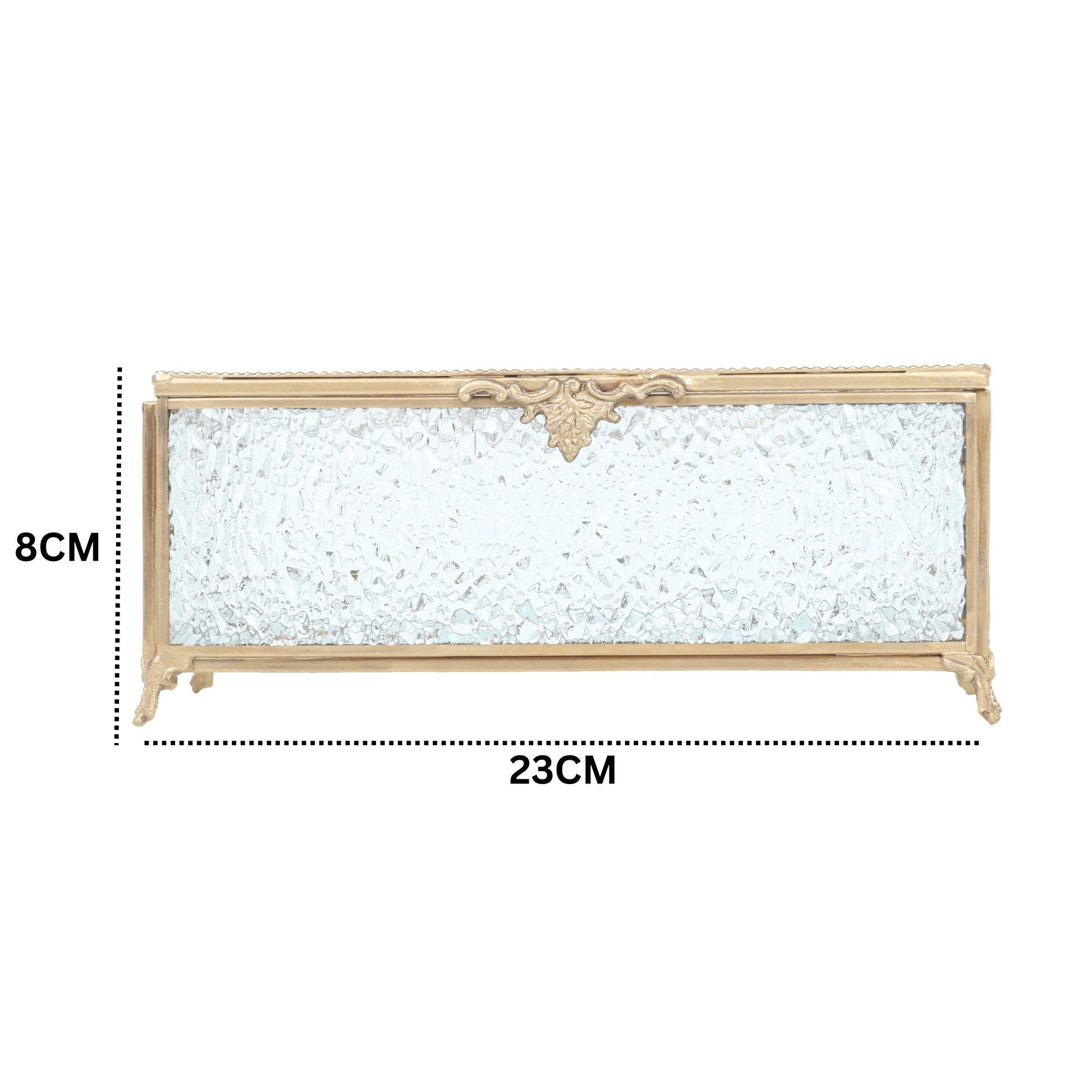 Introducing the Gleaming Crackle Glass Tissue Box, a striking blend of glass and brass that radiates timeless beauty. The crackled glass design adds a touch of texture and intrigue, while the brass borders exude elegance and sophistication. Elevate your decor with this eye-catching tissue box, perfect for showcasing both style and functionality. Keep your tissues close at hand while adding a touch of refinement to your home or office. Embrace the allure of the Gleaming Crackle Glass Tissue Box, a luxurious and charming addition to your living space.