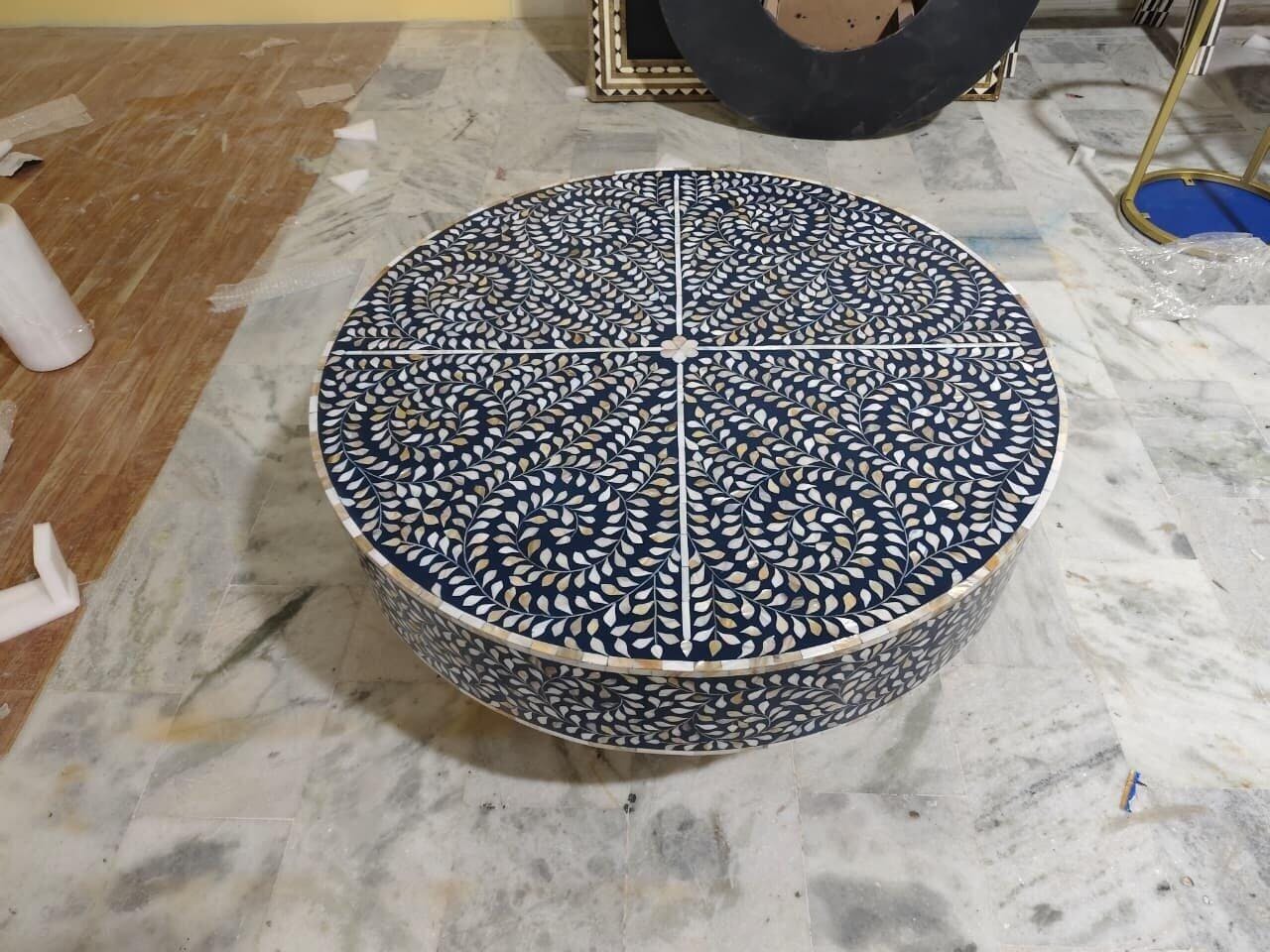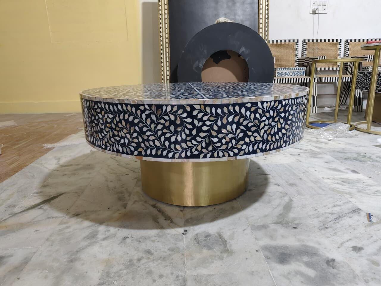 Bring the bone inlay trend into your home with the Cleo bone Inlay coffee table, handcrafted by Indian artisans. With an intricate floral design, golden cylindrical base, Cleo would add glamour to any space. Each piece has been handcrafted in a process that can take weeks using honorably sourced Bone. Delicately carved pieces of bone/MOP have been individually inlaid onto a wooden frame in an elaborate pattern. Layers of cultured resin are then used to fill around the bone/ mop. Finally, the backside and inside areas are painted with the matching colors.