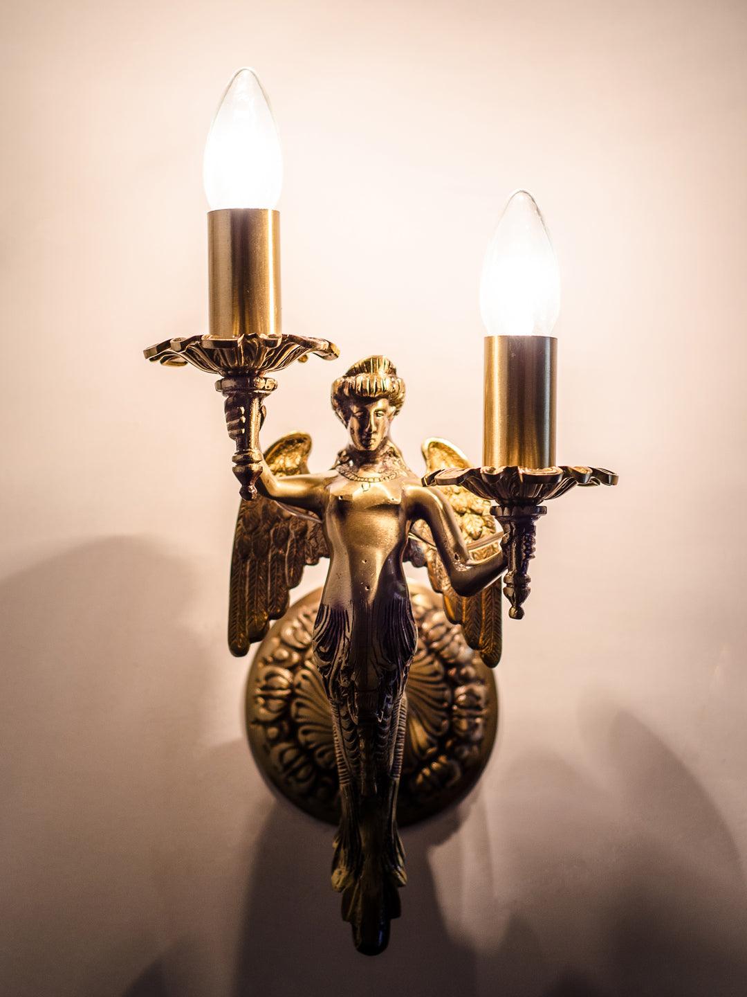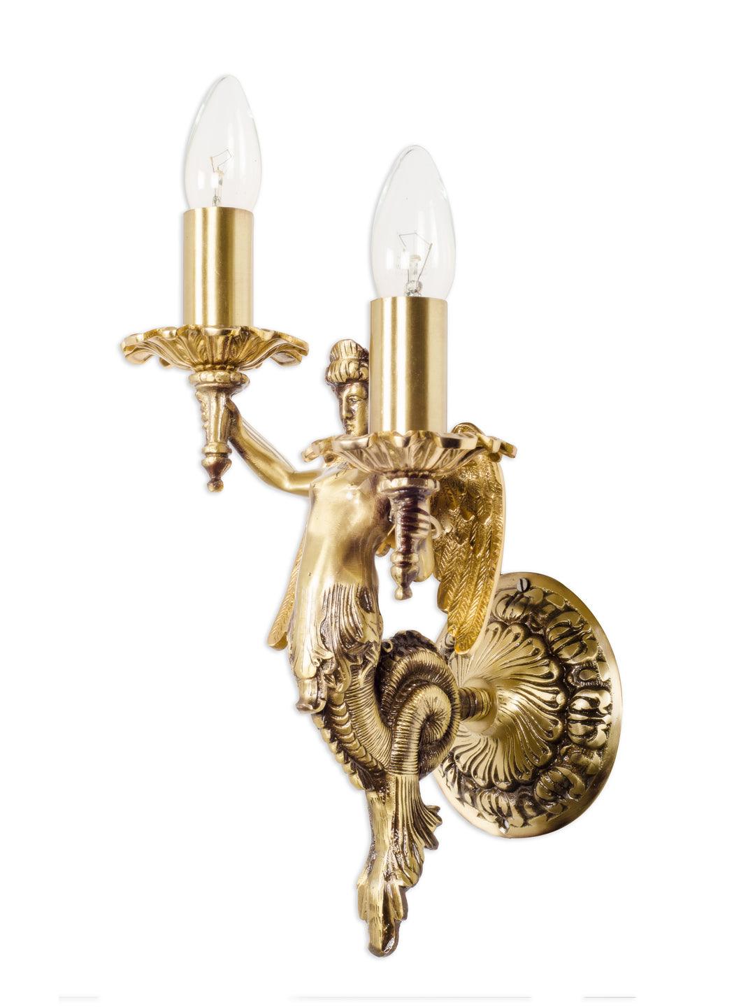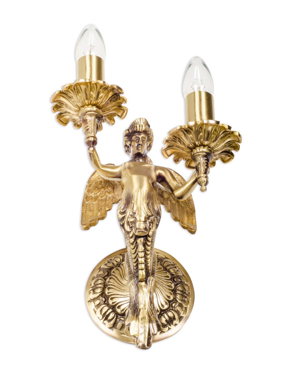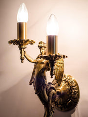 This mermaid inspired wall sconce from Fos collection offers both traditional as well as modern chic look.Winged mermaid in solid brass candelabra sconce, completely cast with polished and contrasting oxidized elements make this chandelier a thing of beauty.