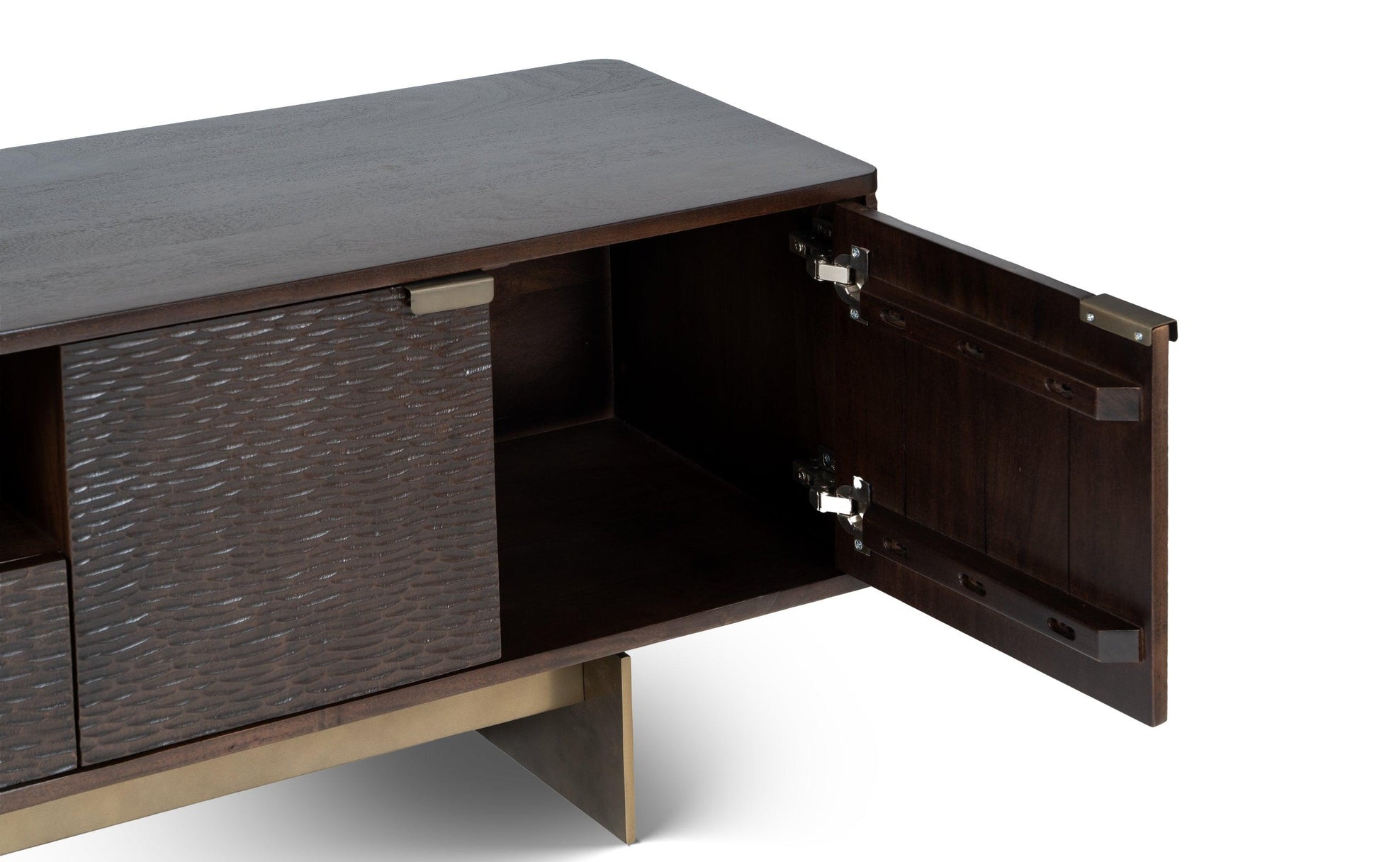 Transform your living space with the Sculpt TV Unit, blending modern design and functionality. Crafted from acacia wood with a medium walnut finish, it features intricate chiselling and brass-finished stainless steel accents. With ample storage, it’s ideal for displaying entertainment or serving as an elegant TV stand.