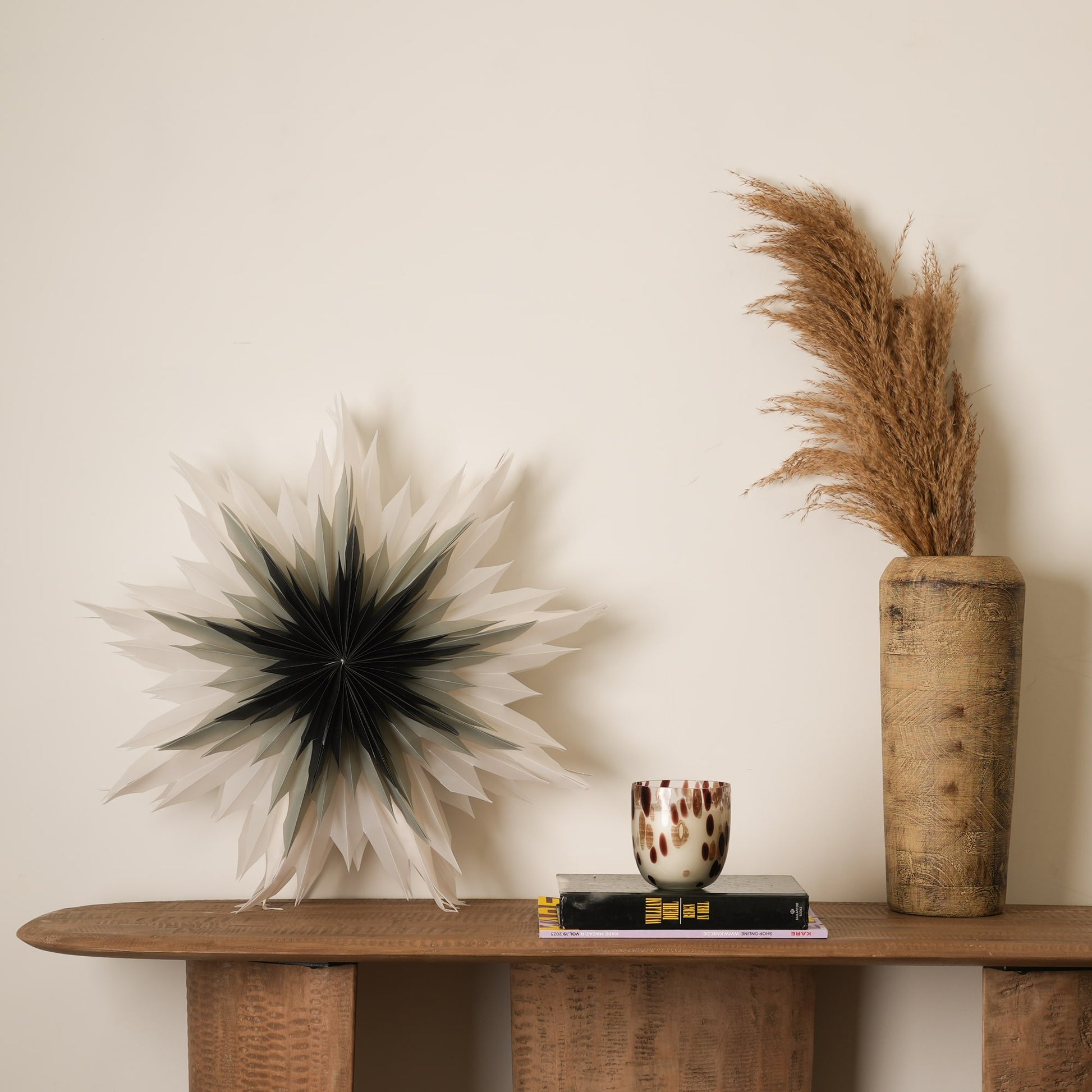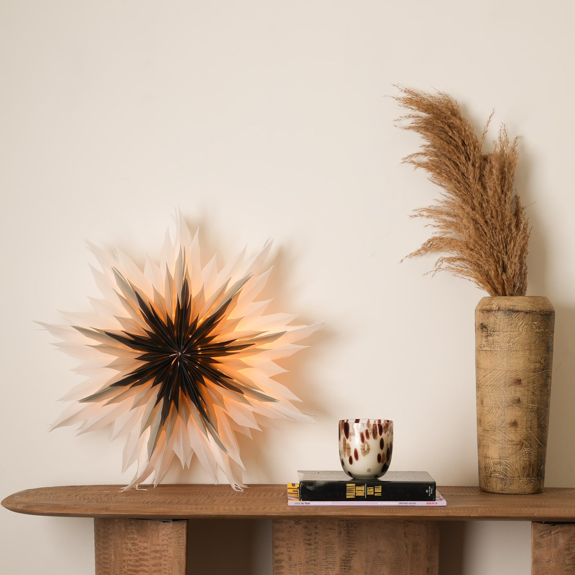 The Black variant brings bold sophistication and depth, creating a dramatic contrast that stands out beautifully in modern homes and evening ambiances.Each lamp is meticulously hand-pleated into a snowflake-inspired floral form, blending traditional paper craftsmanship with modern geometry. When illuminated, the layered paper diffuses light gently, filling your room with a calm, inviting aura that transforms any corner into a statement space.
