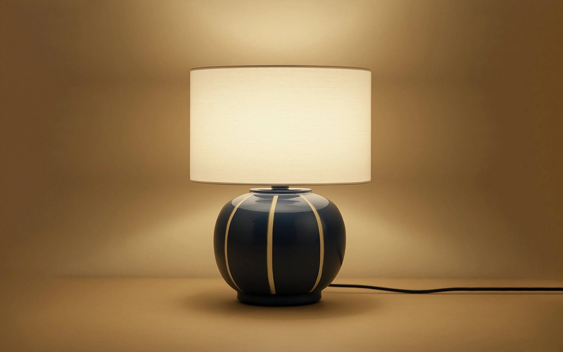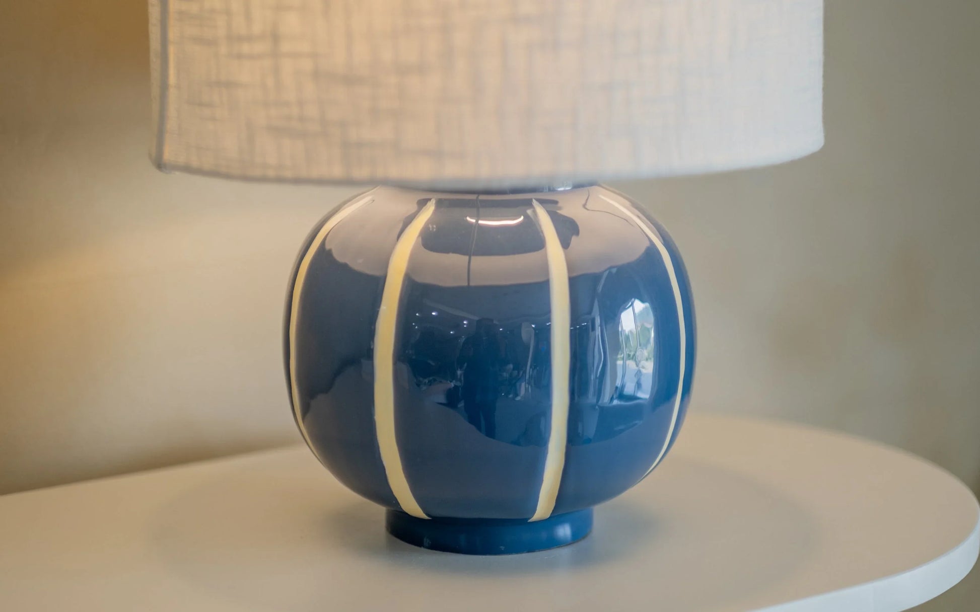Taoza Blue brings serene elegance with its round deep indigo base and fine ivory shade. Handcrafted and grounded in symmetry, it lends timeless style to bedrooms or accent tables.