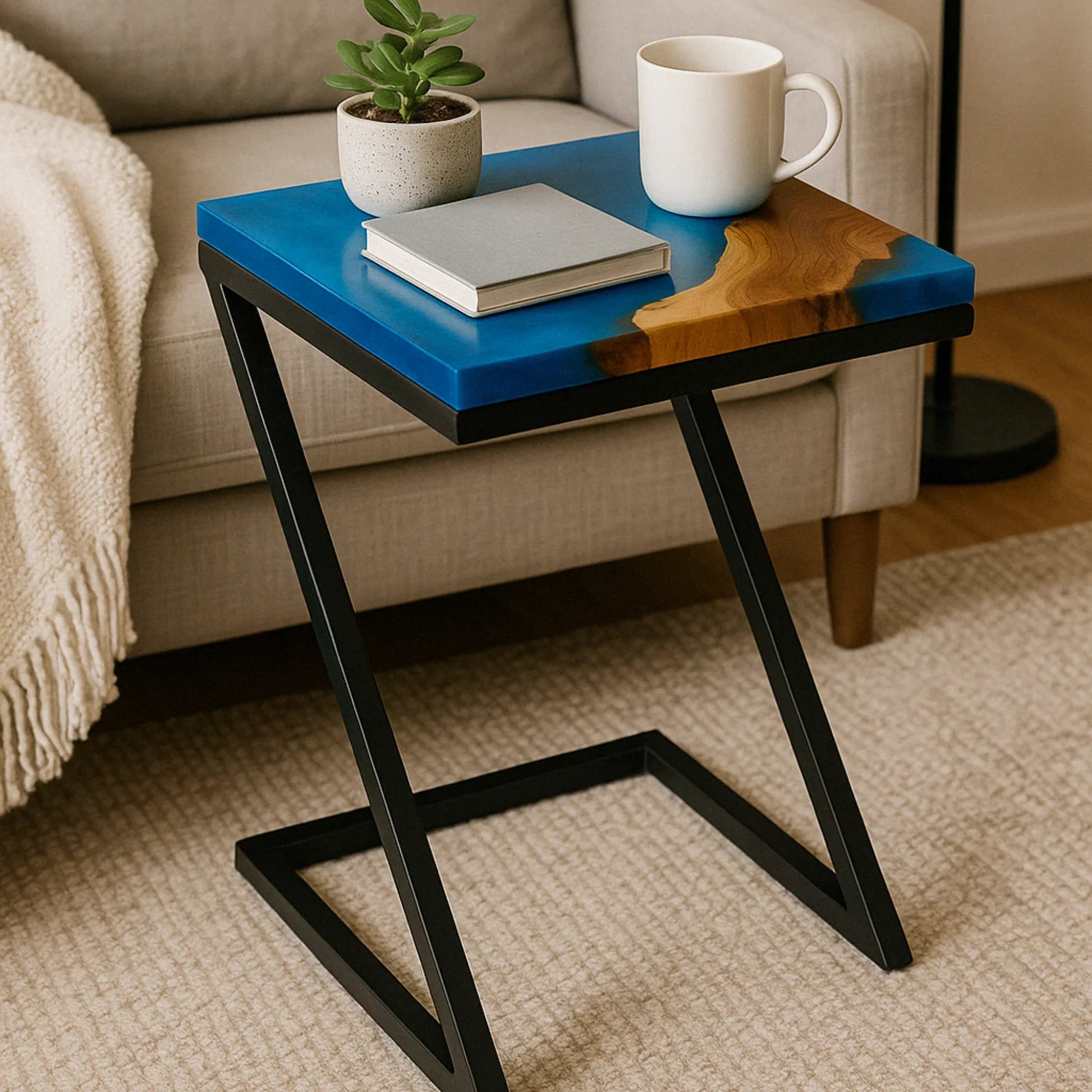 Teak Wood End Table with Aqua Blue Resin | Side Table for Living Room