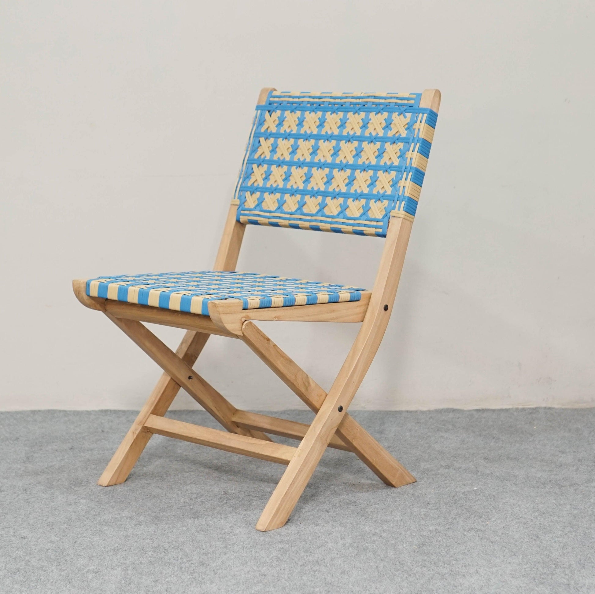 Visby Foldable Teakwood Dining Chair with Blue & Cream Rattan Weave | Wooden Chair