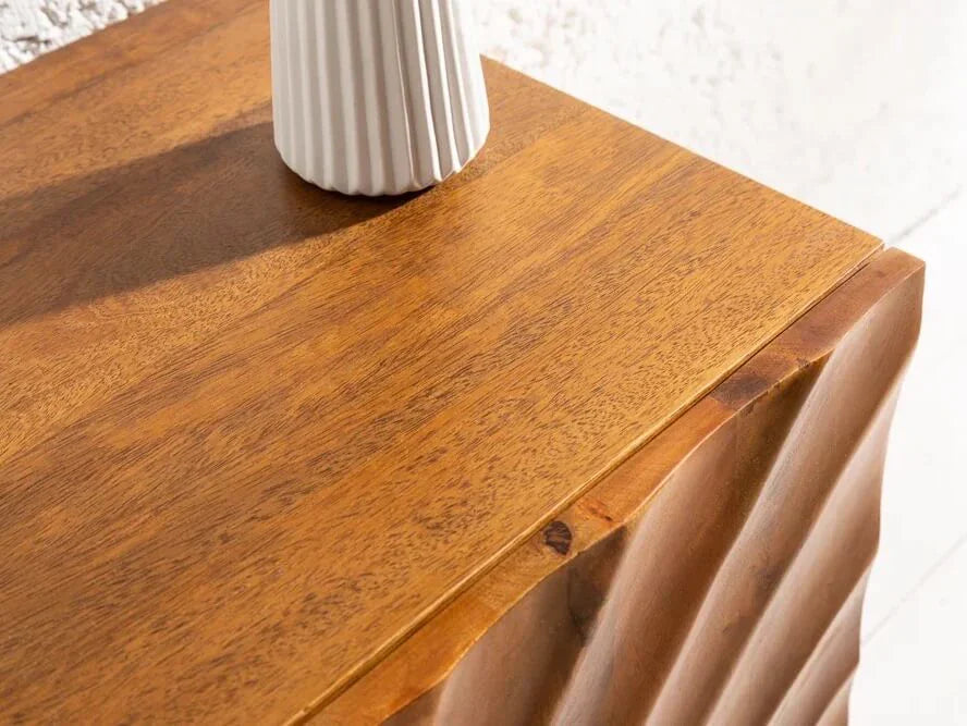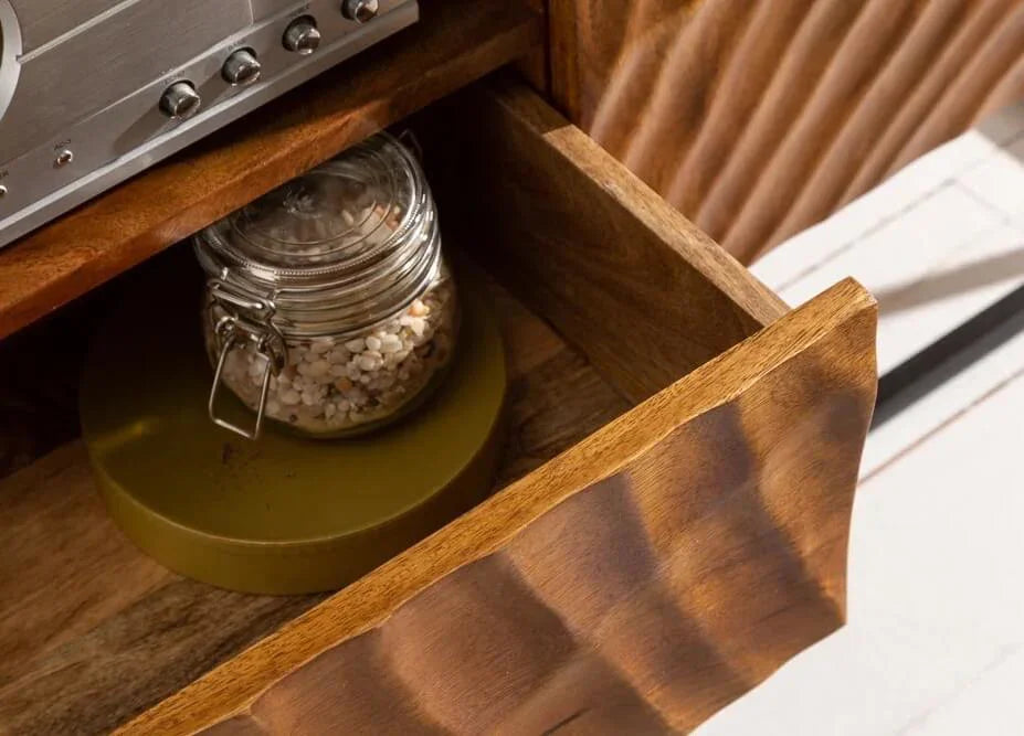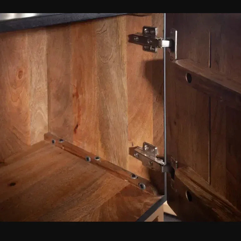 Wave Tv Unit with 2 doors has a robust look and feel with carved shutters, and finishes in a natural finish. Enhance your living room with the Wave TV Unit with 2 Doors, crafted from premium mango wood and sturdy metal for durability and style. Featuring carved shutters and a natural finish, this TV cabinet combines rustic charm with modern functionality, providing ample storage for your media essentials. Its robust design makes it a statement piece for living rooms, home entertainment areas, and stylish interiors, while the spacious compartments keep your space organized and clutter-free. Perfect for contemporary, rustic, and handcrafted furniture lovers.